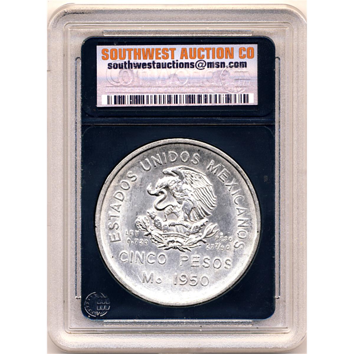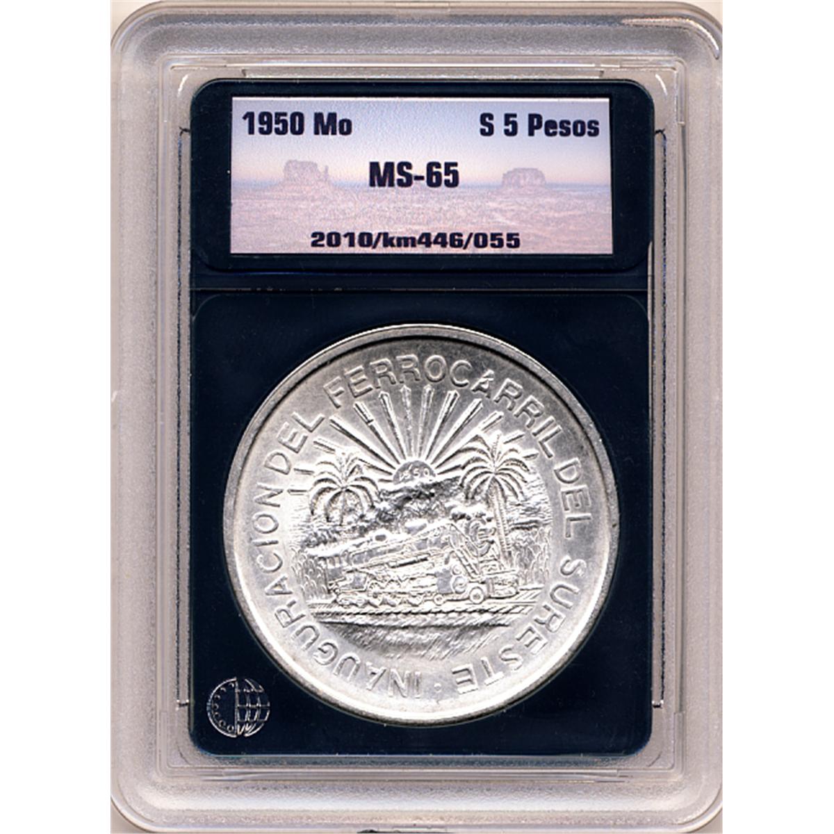 1950-Mo MEXICO SILVER 5 PESOS RAILROAD-MS-65