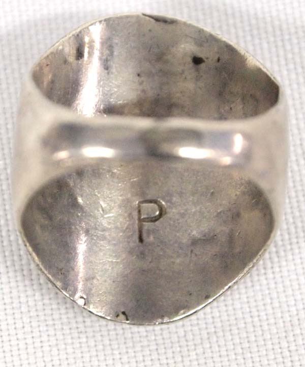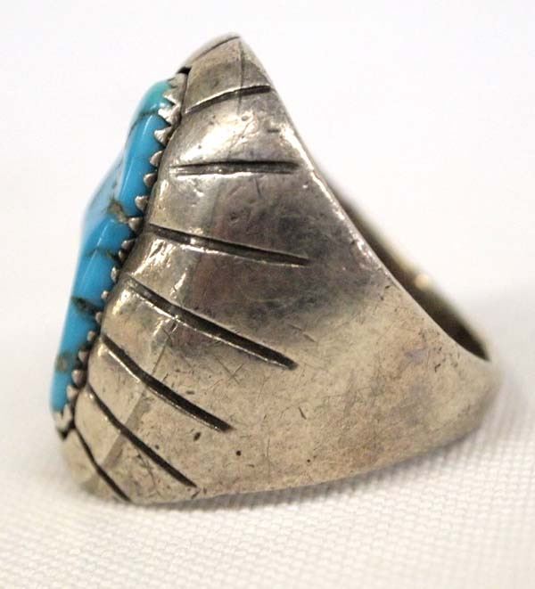 1950 Native American Navajo Sterling Silver Turquoise Ring, Size 10, hallmarked P, measures .75'' x 1''L, 15.6g in total wt.