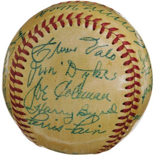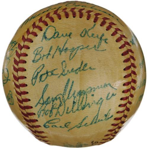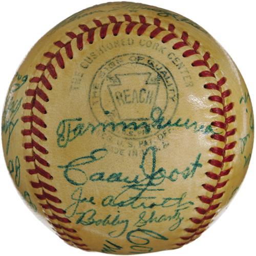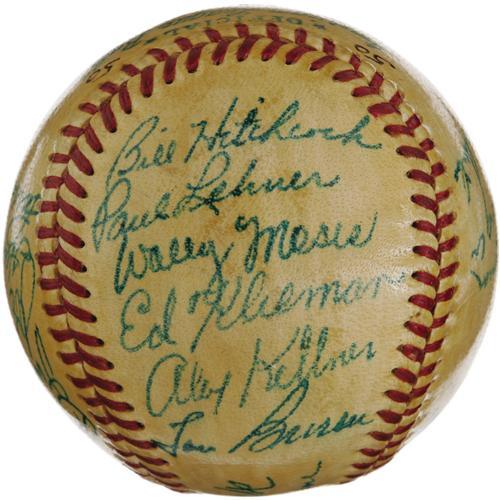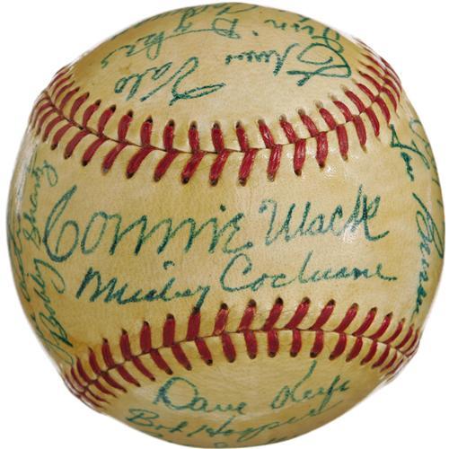 <B>1950 Philadelphia Athletics Team Signed Baseball with Mack, Cochrane.</B></I> The old man served the last of his sixty-six seasons in baseball this year at age eighty-seven, limping to an eighth place finish with 102 losses. But despite the fact that the team that applied its signatures to this OAL (Harridge) ball was anything but memorable, the appearance of Mack with fellow Athletics Hall of Famer Mickey Cochrane on the sweet spot makes this particular sphere a real treasure. These two autographs, and the twenty-one that join them, remain in remarkably strong 9+/10 condition. Other names include Valo, Dykes, Fain, Joost and Shantz. A coating of shellac is to thank for the exceptionally strong state of this ball. <I>LOA from PSA/DNA. LOA from James Spence Authentication.</B></I><BR><BR><b>Shipping:</b> Balls, Pucks, etc., Small (<a target="_blank" href="http://www.heritageauctions.com/common/shipping.php">view shipping information</a>)