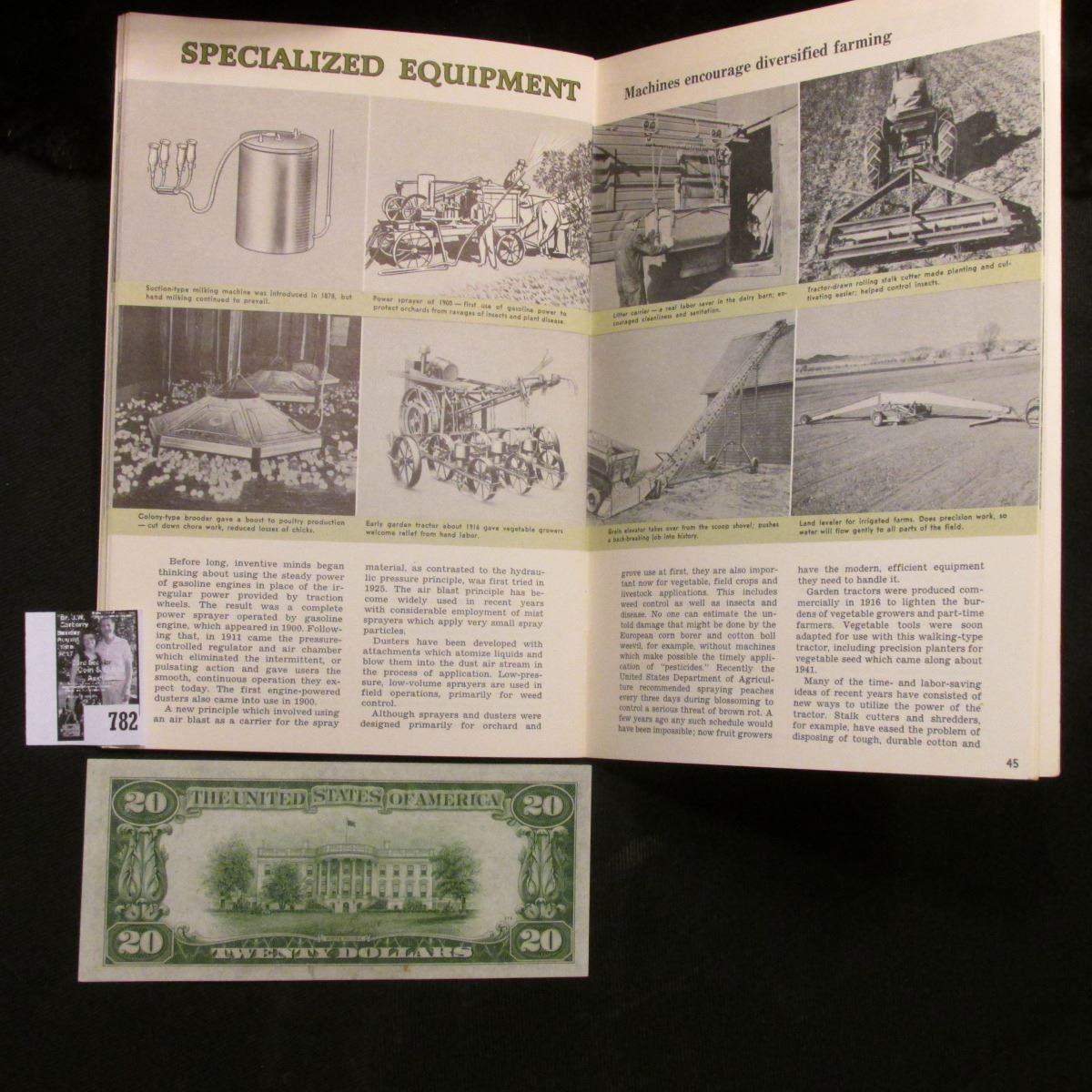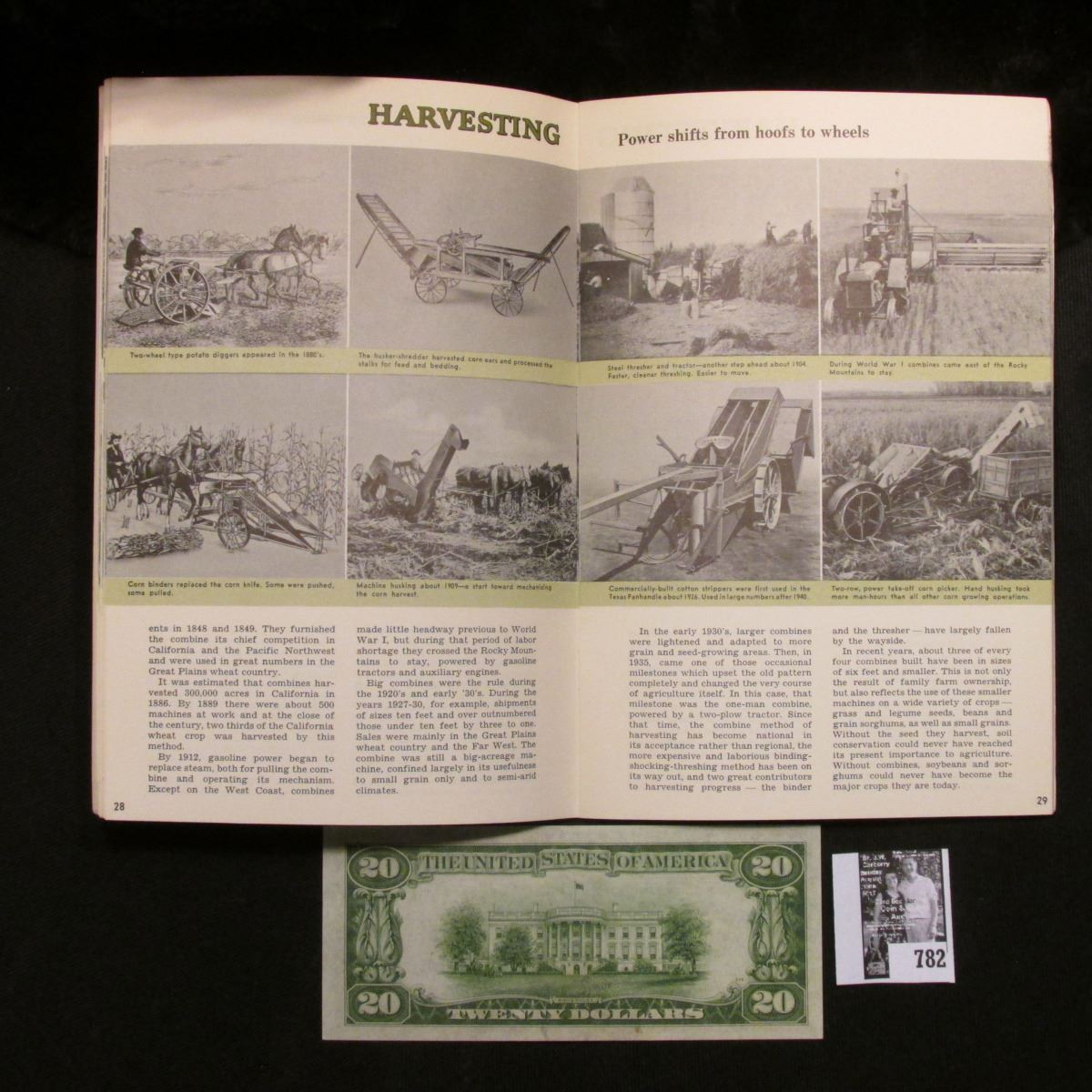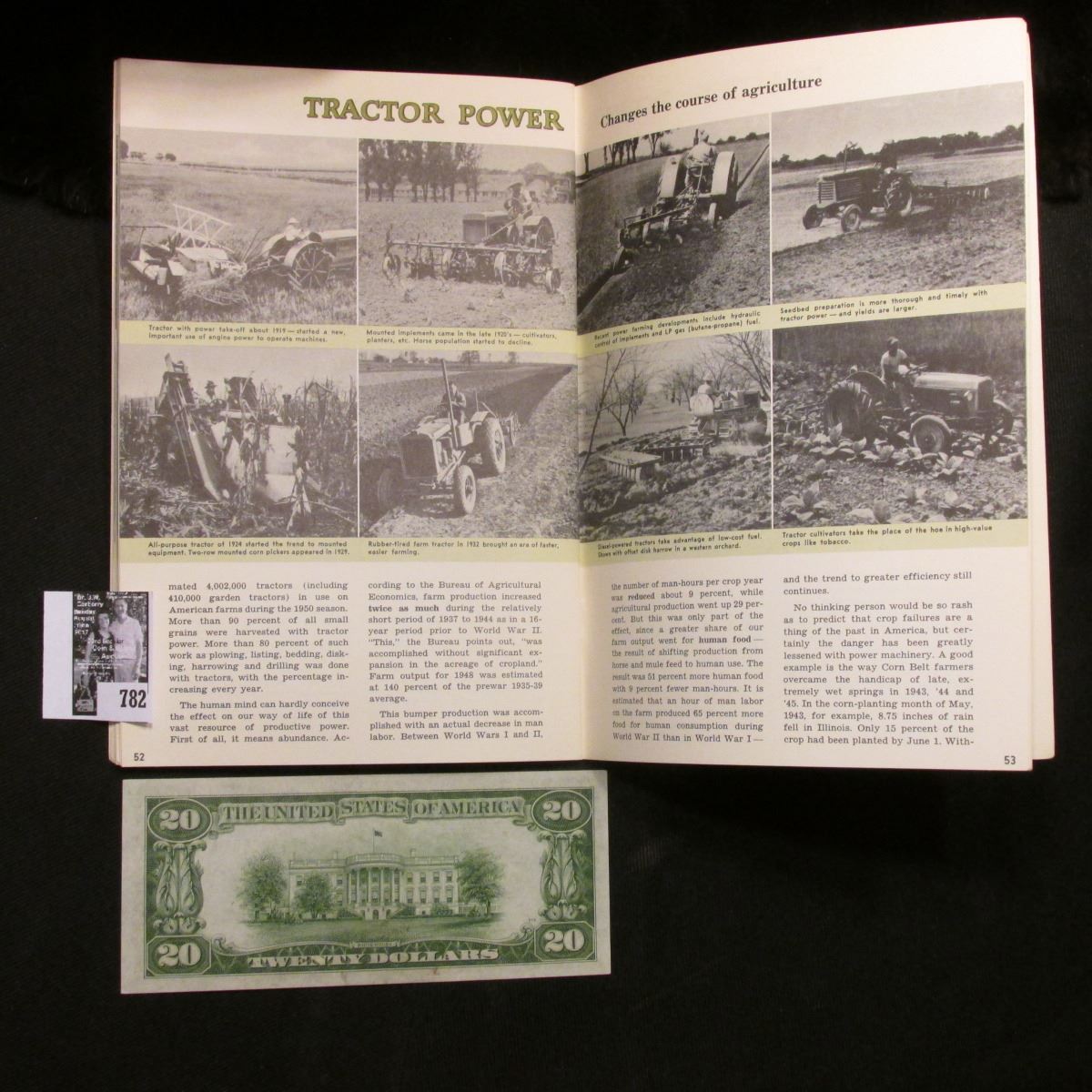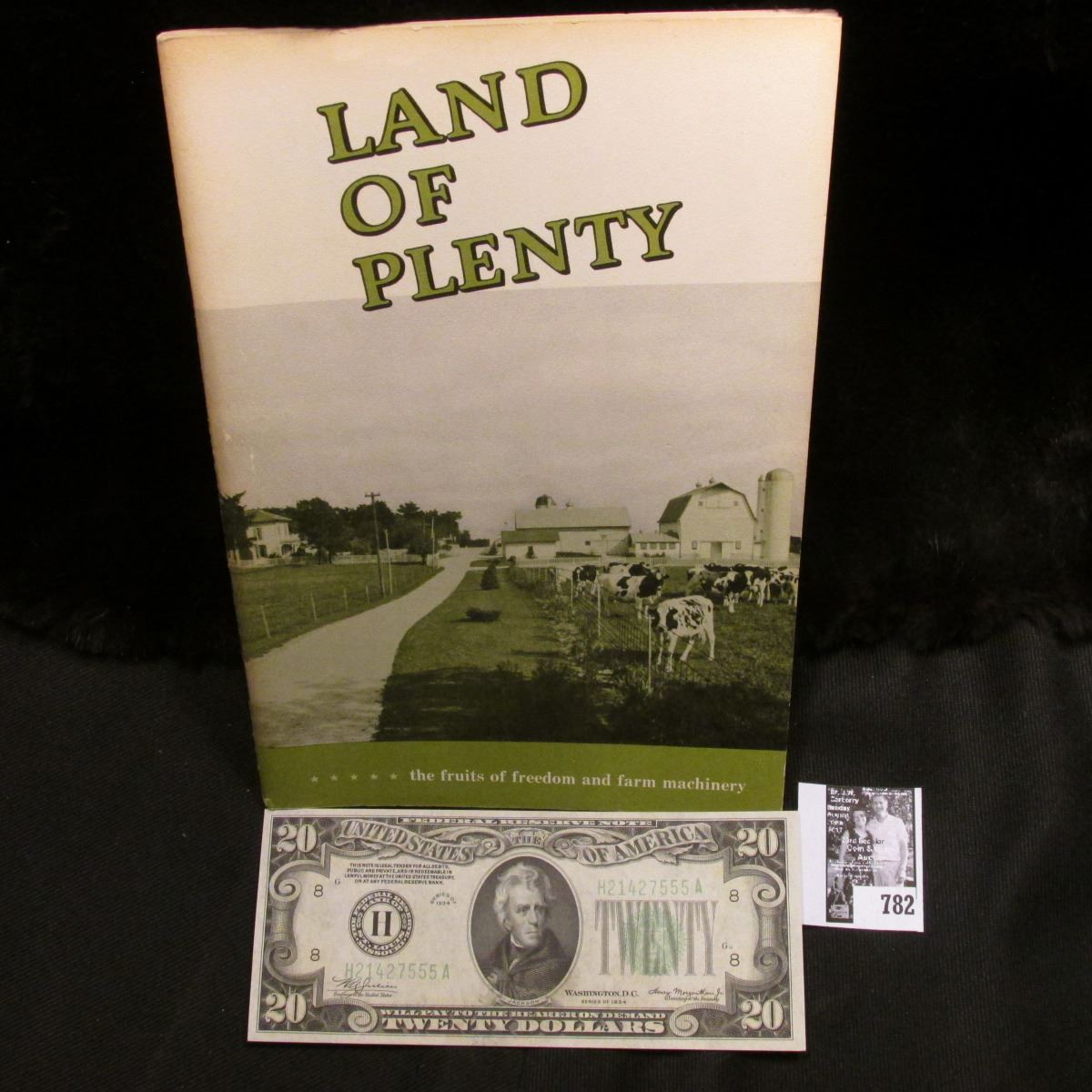 1950 Preliminary Edition "Land of Plenty***** the fruits of freedom and farm machinery", published by Farm Equipment Institue Chicago:1950", (depicts many pieces of farm equipment); & a Crisp Uncirculated Series 1934 $20 St. Louis, Missouri Federal Reserve Note.