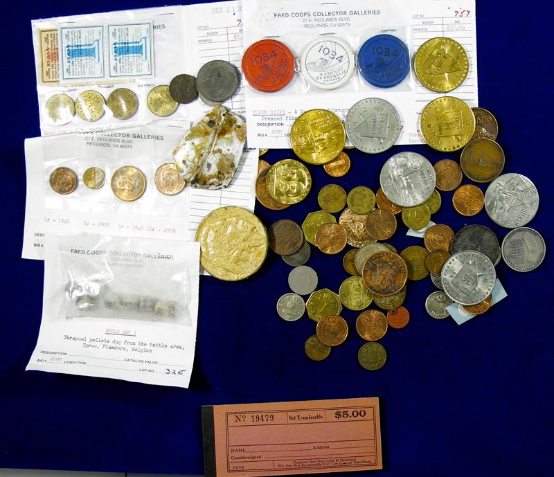 Token and Coin Grab Bag! Lot of MANY items, primarily concerning tokens and coins dating from between the 1950’s and today. Many of the items are foreign and come from various regions of Europe, Asia and North America. Items include low value coins, commemorative coins and tokens, poker chips, trade tokens, coupons, raffle tickets, knick knacks and small collectables. All items are in good condition and most are in their own plastic containers or envelopes. Various colors and sizes.