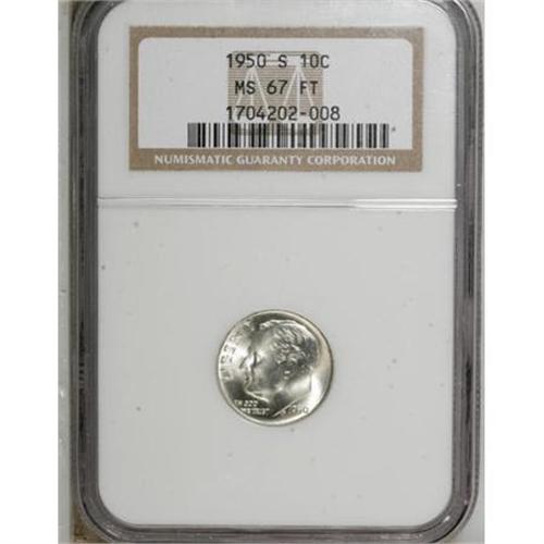 <B>1950-S 10C MS67 Full Bands NGC.</B></I> NGC Census: (0/0). PCGS Population (20/1). Mintage: 20,440,000. (#85096)<BR><BR><B>Coin Engraver:</B> John R. Sinnock<BR><BR><b>Shipping:</b> Coins & Currency (<a target="_blank" href="http://www.heritageauctions.com/common/shipping.php">view shipping information</a>)