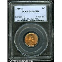 1950-S 1C MS66 Red PCGS. A lustrous and near-prist <B>1950-S 1C MS66 Red PCGS.</B></I> A lustrous and near-pristine Superb Gem. Well struck aside from Lincoln's beard and LU in PLURIBUS. A few tiny toning flecks are noted, in the left obverse and upper right reverse fields. <BR><BR><B>Important notice:</B> Heritage usually auctions material at the rate of 200-250 lots per hour. On some occasions eBay Live bid software or the Internet may not be able to keep up with the pace of the auction. We recommend placing a realistic absentee bid now as insurance to avoid disappointment. Occasionally the auctioneer may eliminate or reject an eBay Live bid, and the auctioneer may also reopen a lot after the close of the eBay live bidding (usually because we missed an audience bid), and may reject your bid even if it shows you as the winning bidder. By bidding via eBay Live, you agree that Heritage may award the lot to another bidder at its sole discretion under the circumstances described above or any other reasonable circumstances. Since eBay bids are not shown to us until we open the lot on the floor, we treat those bids just like floor bids. In most cases the floor responds before the eBay bid is presented to us, due to Internet lag time, so for consistency we have made it a policy that floor bids are always considered first over tie eBay live bids. Also please note that all Heritage lots purchased through eBay Live carry a 20% Buyer's Premium. Please make sure you read the Terms and Conditions before you bid. This lot is being auctioned in conjunction with a live floor auction by Heritage Galleries & Auctioneers. All final auction and invoice information will be supplied by Heritage Galleries & Auctioneers, and all other information should be considered preliminary. Lot:5374