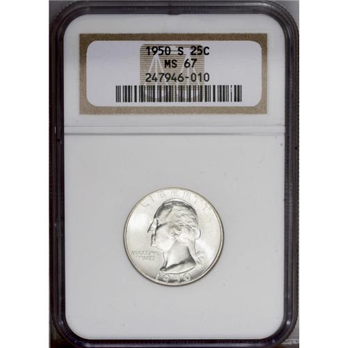 1950-S 25C MS67 NGC. Both sides exhibit frosty luster, 1950-S[25C] MS67 NGC.