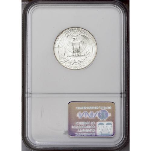 <B>1950-S<25C> MS67 NGC.</B></I> Both sides exhibit frosty luster, and the nearly untoned surfaces show just a few dapples of gold-tan color in the right (facing) obverse field. The design elements are nicely struck, though minor softness is noted in a couple of the letters of AMERICA. Some minute handling marks on Washington's cheek are mentioned for accuracy. NGC has certified a mere two specimens finer (1/06).