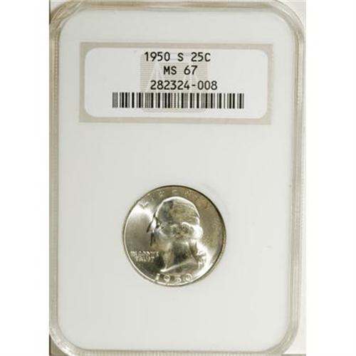 <B>1950-S 25C MS67 NGC.</B></I> NGC Census: (203/2). PCGS Population (49/0). Mintage: 10,284,004. Numismedia Wsl. Price for NGC/PCGS coin in MS67: $165. (#5844)<BR><BR><B>Coin Engraver:</B> John Flanagan<BR><BR><b>Shipping:</b> Coins & Currency (<a target="_blank" href="http://www.heritageauctions.com/common/shipping.php">view shipping information</a>)