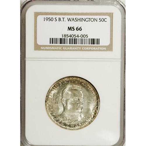 <B>1950-S 50C Booker T. Washington MS66 NGC.</B></I> NGC Census: (570/88). PCGS Population (314/11). Mintage: 512,091. Numismedia Wsl. Price for NGC/PCGS coin in MS66: $132. (#9422)<BR><BR><b>Shipping:</b> Coins & Currency (<a target="_blank" href="http://www.heritageauctions.com/common/shipping.php">view shipping information</a>)