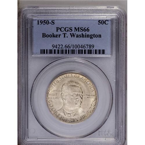 <B>1950-S<50C> Booker T. Washington MS66 PCGS.</B></I> A sharply struck and highly attractive Premium Gem with brilliant silver surfaces beneath light champagne toning. This is considered a common date with a mintage of 512,091 coins.