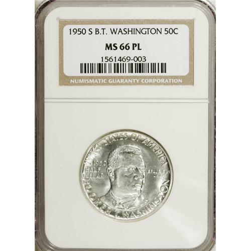 <B>1950-S 50C Booker T. Washington MS66 Prooflike NGC.</B></I> Brilliant throughout with flashy prooflike fields. As indicated by the MS66 grade, the surfaces are unusually clean for this normally heavily abraded type. Population: 13 in MS66 Prooflike, none are finer (4/07).<BR><BR><b>Shipping:</b> Coins & Currency (<a target="_blank" href="http://www.heritageauctions.com/common/shipping.php">view shipping information</a>)