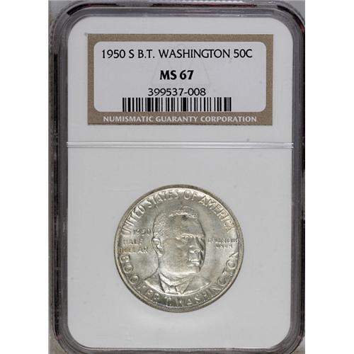 <B>1950-S<50C> Booker T. Washington MS67 NGC.</B></I> This mildly prooflike Superb Gem is virtually as made, aside from delicate coating of hazy, milky toning. Minor incompleteness of strike on the jaw is customary for the commemorative type. Census: 31 in 67, 0 finer (7/06).