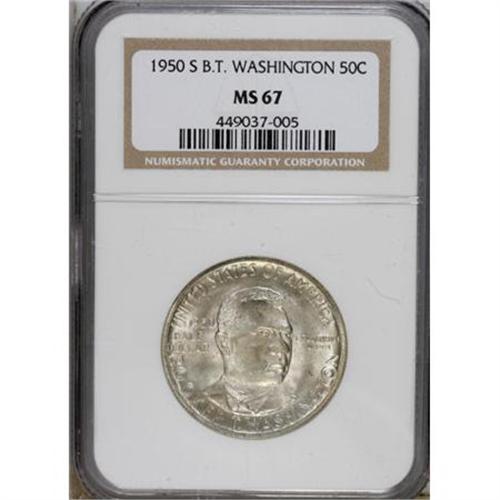 <B>1950-S 50C Booker T. Washington MS67 NGC.</B></I> Well struck and softly lustrous beneath thin gold and blue toning. This minimally marked representative is tied for the finest certified by either service. Census: 44 in 67, 0 finer (5/07). <BR><BR><b>Shipping:</b> Coins & Currency (<a target="_blank" href="http://www.heritageauctions.com/common/shipping.php">view shipping information</a>)