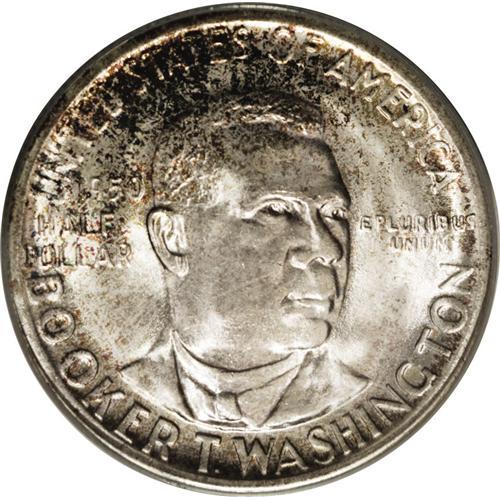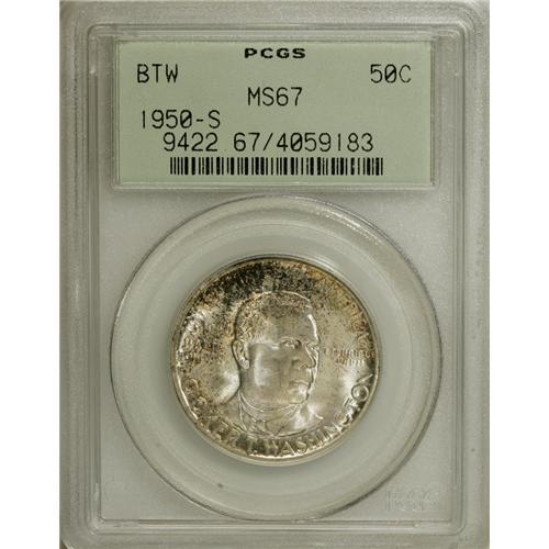 <B>1950-S 50C Booker T. Washington MS67 PCGS.</B></I> Powder-blue, sea-green, and golden-russet verify the originality of this lustrous and remarkably preserved Superb Gem. A wonderful piece that will never need to be upgraded. Housed in an old green label holder. Population: 10 in 67, 0 finer (1/07).<BR><BR><b>Shipping:</b> Coins & Currency (<a target="_blank" href="http://www.heritageauctions.com/common/shipping.php">view shipping information</a>)