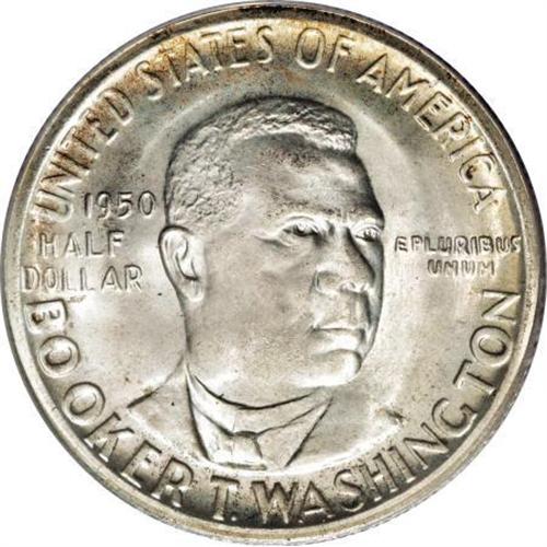 <B>1950-S 50C Booker T. Washington MS67 PCGS.</B></I> Honey-gold toning enriches the obverse periphery along with selected portions of the reverse. This unabraded Superb Gem has an unusually clear strike on the lower cheek. Isaac Scott Hathaway designed both commemorative types featuring Booker T. Washington. Population: 14 in 67, 0 finer (11/07).<BR><BR><b>Shipping:</b> Coins & Currency (<a target="_blank" href="http://www.heritageauctions.com/common/shipping.php">view shipping information</a>)