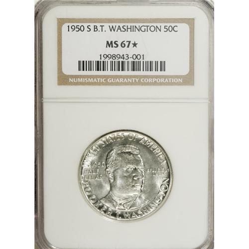 <B>1950-S 50C Booker T. Washington MS67 <img border='0' src='http://www.heritagecoins.com/images/star.gif' width=10 height=10> NGC.</B></I> Solidly struck with highly lustrous and essentially untoned surfaces. Minimally marked for the grade with incredible eye appeal, and tied for the finest certified by either NGC or PCGS (1/07).<BR><BR><b>Shipping:</b> Coins & Currency (<a target="_blank" href="http://www.heritageauctions.com/common/shipping.php">view shipping information</a>)