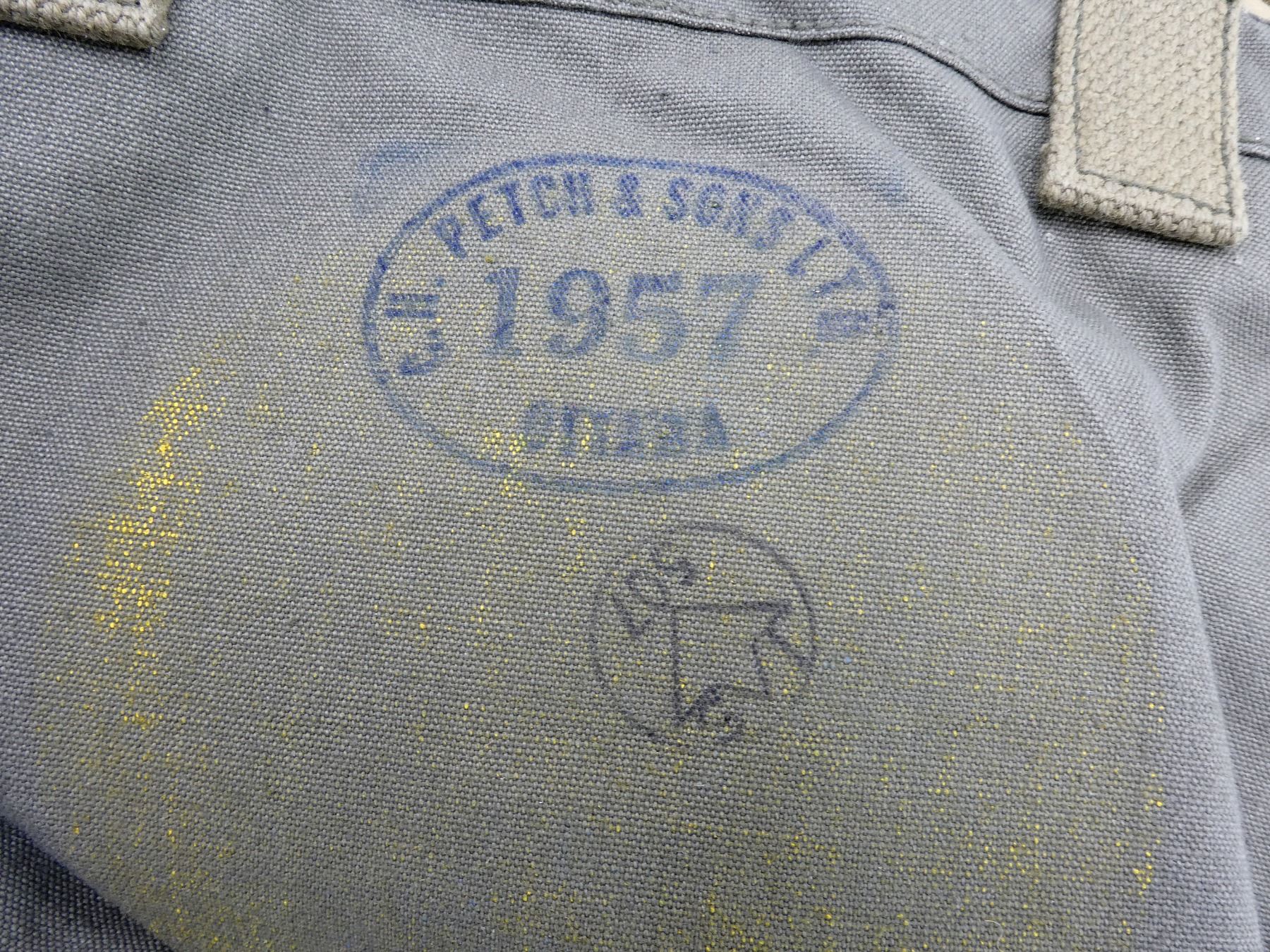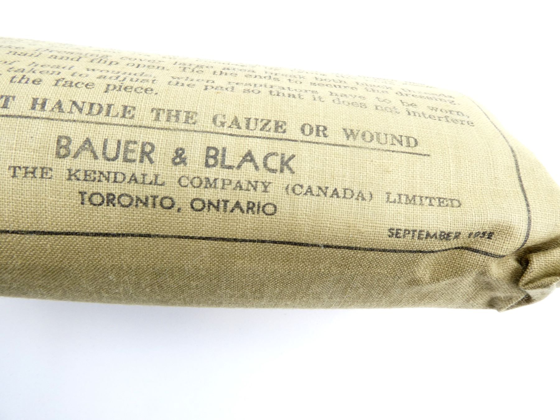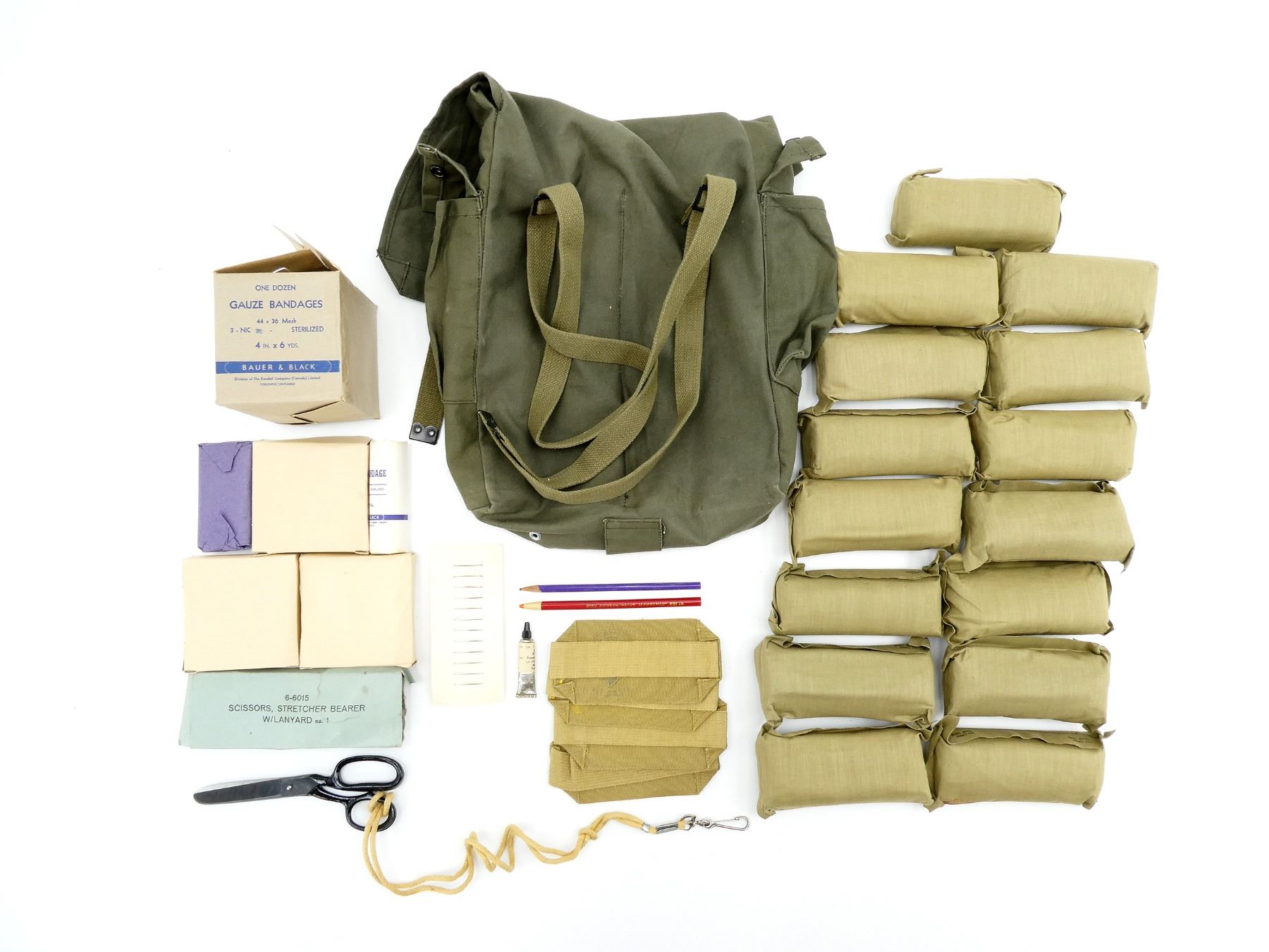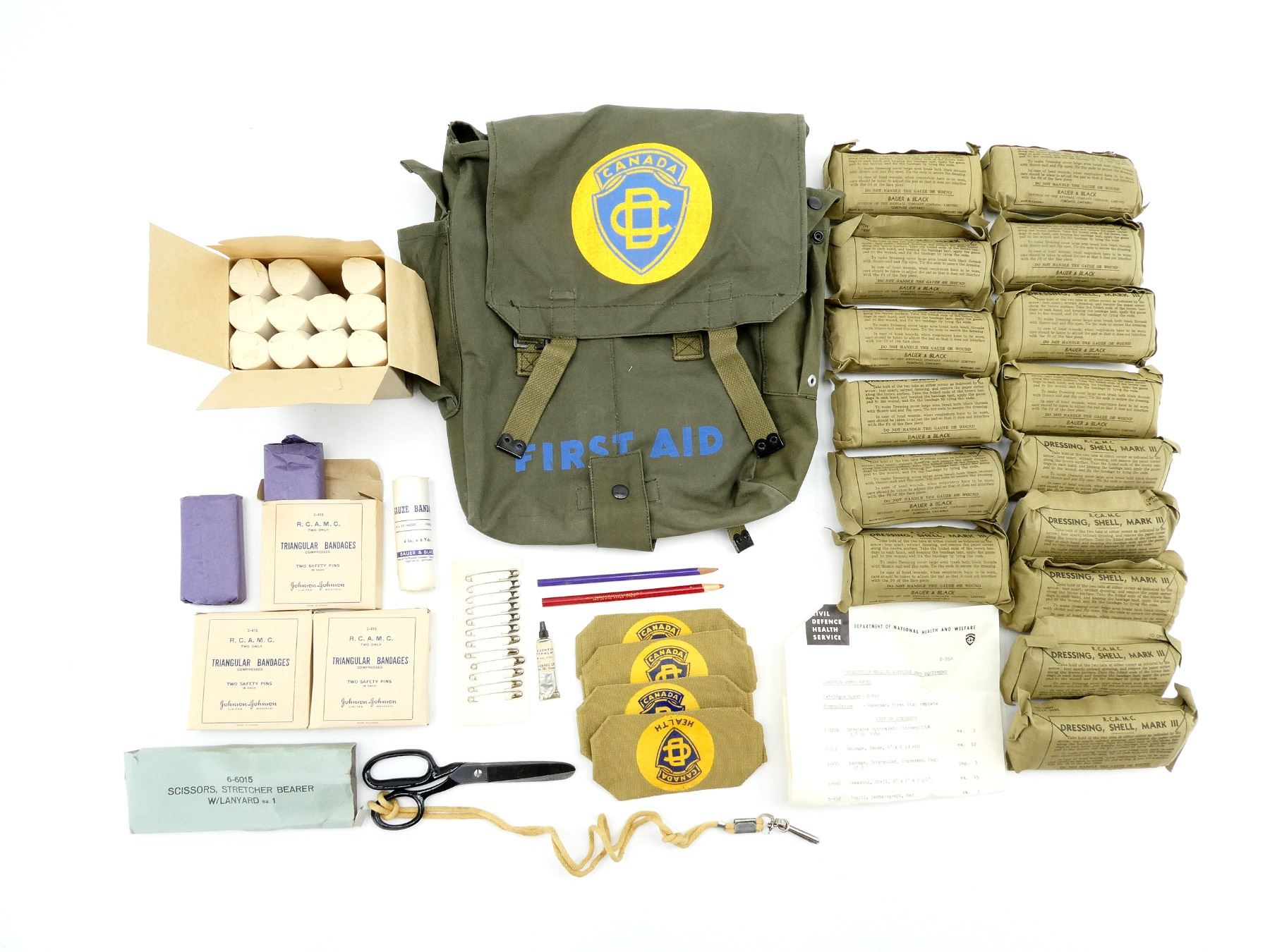 (1) GREEN CANVAS FIRST AID HAVERSACK WITH SHOULDER STRAP, MARKED: "CANADA, CD", "FIRST AID", "C.H. PETCH & SONS LTD., 1957, OTTAWA" WITH MAPLE LEAF PROOF MARK, CIVIL DEFENCE HEALTH SERVICE TYPED CATALOGUE OF MEDICAL SUPPLIES, COMES WITH; (15) MARK III SHELL DRESSINGS, DATED 1952, (12) GAUZE BANDAGES IN ORIGINAL BOX, (1) CARD OF TWELVE SAFETY PINS, (3) PACKAGES OF TWO TRIANGULAR BANDAGES, (1) RED DERMATOGRAPH PENCIL, (1) PENCIL, (1) PAIR OF STRETCHER BEARER SCISSORS WITH LANYARD, (4) CIVIL DEFENCE ARMBANDS, MARKED: "CANADA, CD, HEALTH", ETC. SEE PHOTOS.