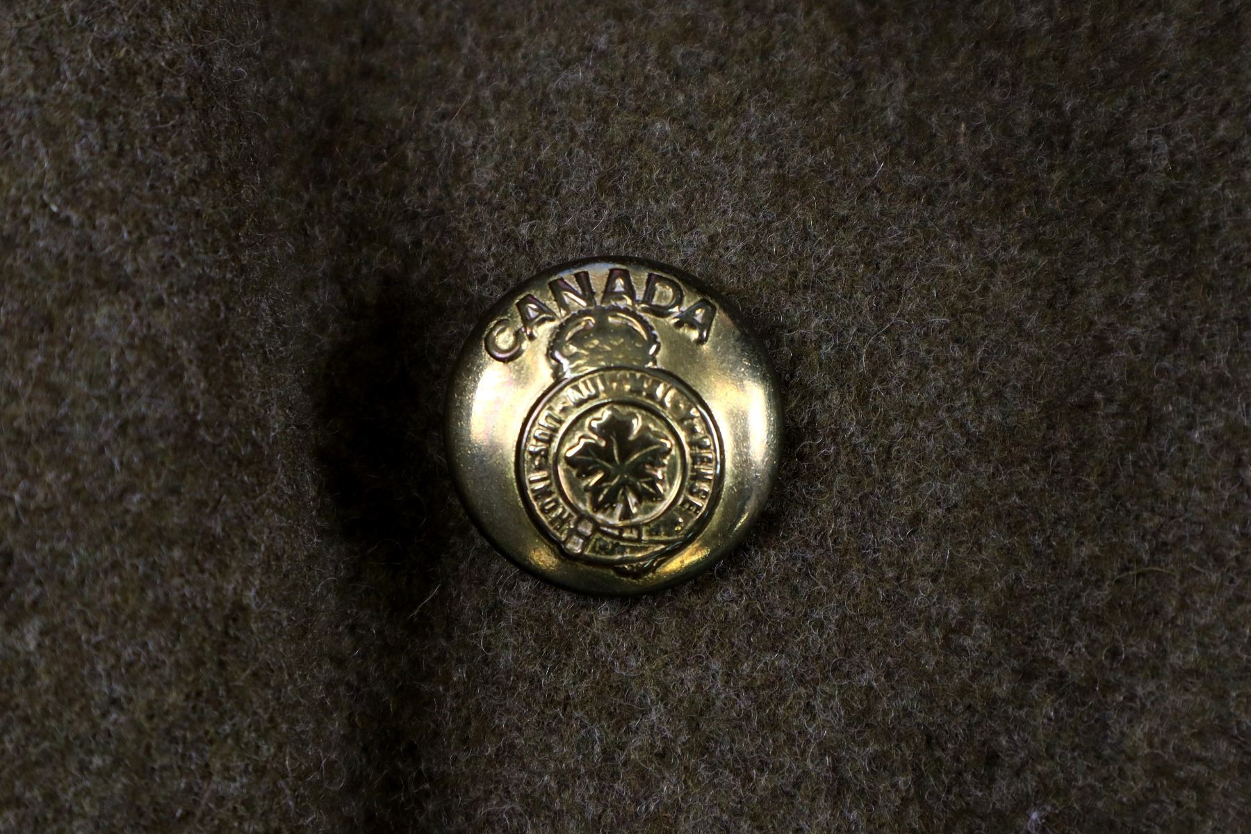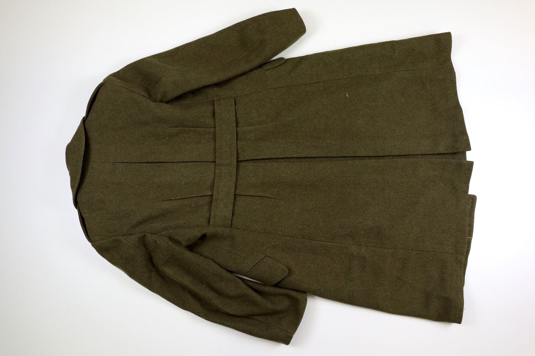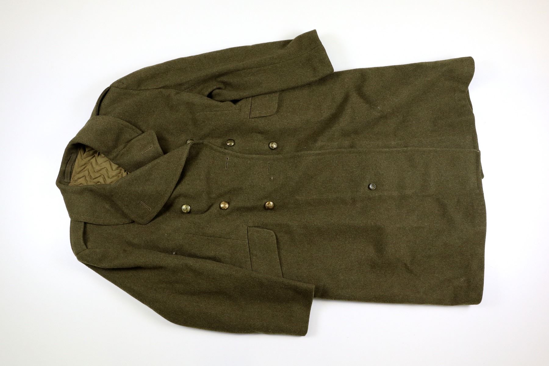 (1) GREEN WOOL GREAT COAT, MARKED: "FASHION-CRAFT, GREATCOATS, ARMY, 49 PATTERN, 1952, SIZE 13, HEIGHT 5'9" TO 5'10", BREAST 41-43" WITH MAPLE LEAF PROOF MARK, DOUBLE-BREASTED, BRASS KING'S CROWN CANADA BUTTONS, BUTTON FRONT. SEE PHOTOS.