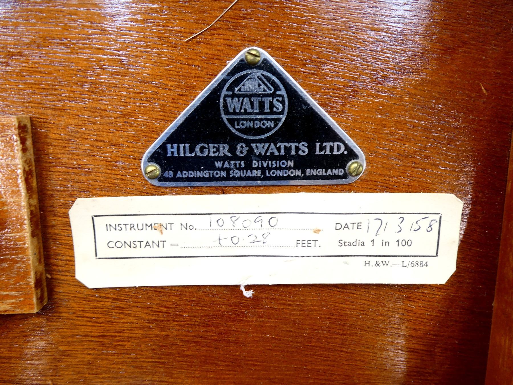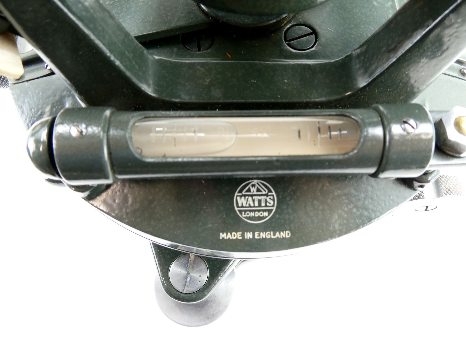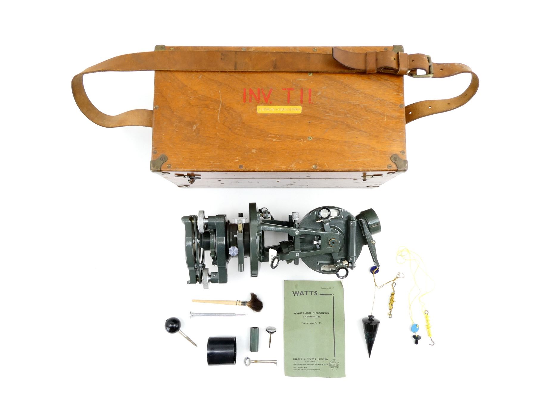 (1) SURVEYING INSTRUMENT WITH ROTATING TELESCOPE USED TO MEASURE HORIZONTAL / VERTICAL ANGLES, MICROMETER FOR MEASURING SMALL DISTANCES OR THICKNESSES BETWEEN TWO FACES, VERNIER A SMALL MOVABLE GRADUATED SCALE FOR OBTAINING FRACTIONAL PARTS OF SUBDIVISIONS ON A FIXED MAIN SCALE SUCH AS BAROMETERS, SEXTANTS, ETC., INSTRUMENT MARKED: "WATTS, LONDON, MADE IN ENGLAND", "HILGER & WATTS LTD, NO 108090", COMES WITH WOODEN CARRY CASE WITH LEATHER SHOULDER STRAP, VARIOUS WRENCHES, BRUSH, SCREWDRIVER, OILER, INSTRUCTION BOOKLET, ETC., GREEN PAINTED METAL CONSTRUCTION, ALL LENSES INTACT, FAIRLY CLEAR OPTICS, BUBBLE LEVELS INTACT, APPROX. 6" X 5.5" X 13.75", WOODEN CASE MARKED: "INV. TII, 6675/21/804/7755", INSTRUCTION BOOKLET DATED 1958, CASE SHOWS WEAR, MISSING A LATCH, WOODEN CASE APPROX. 16" X 8.25" X 7.5". SEE PHOTOS.