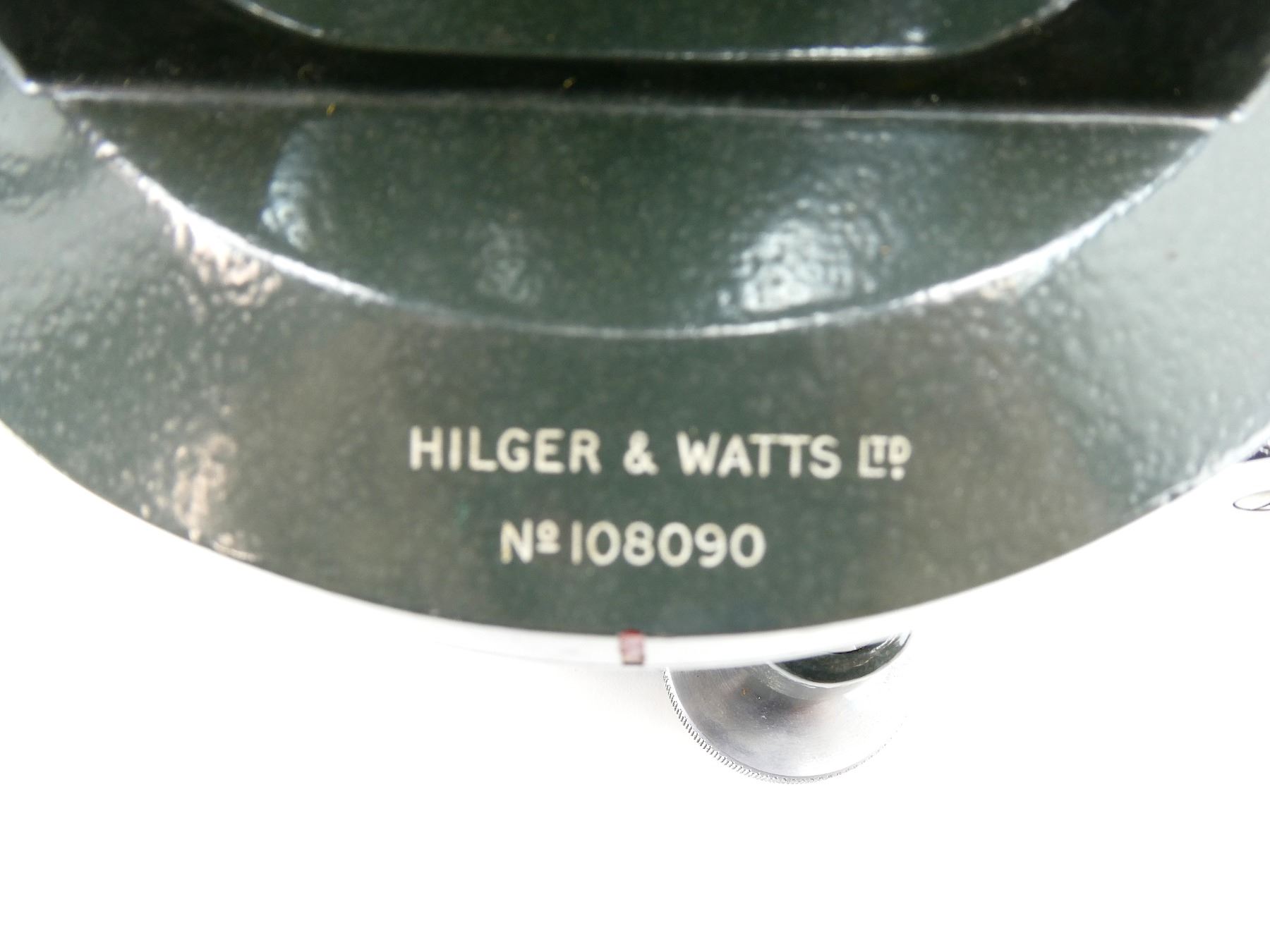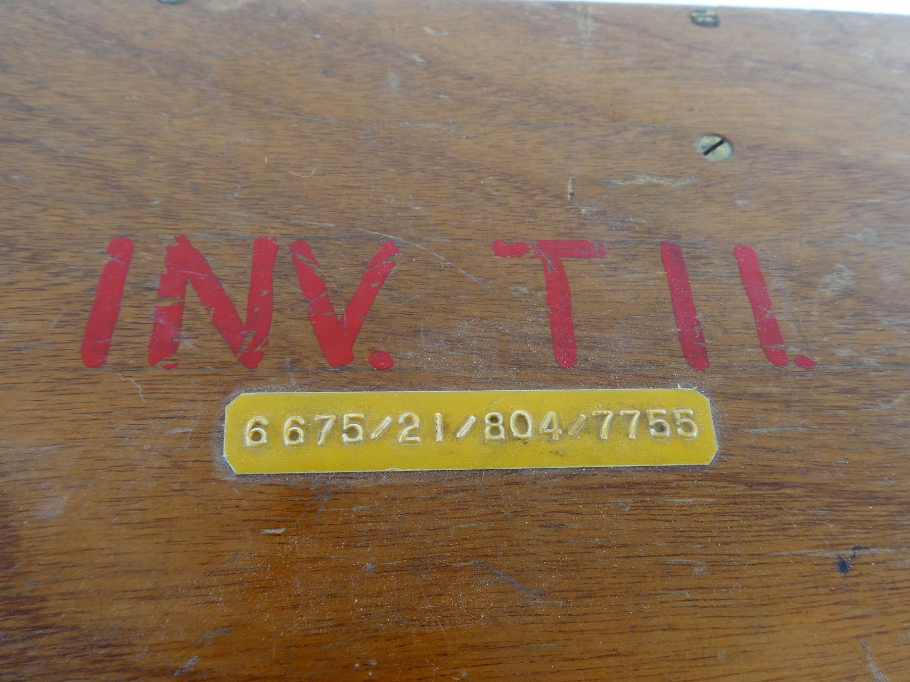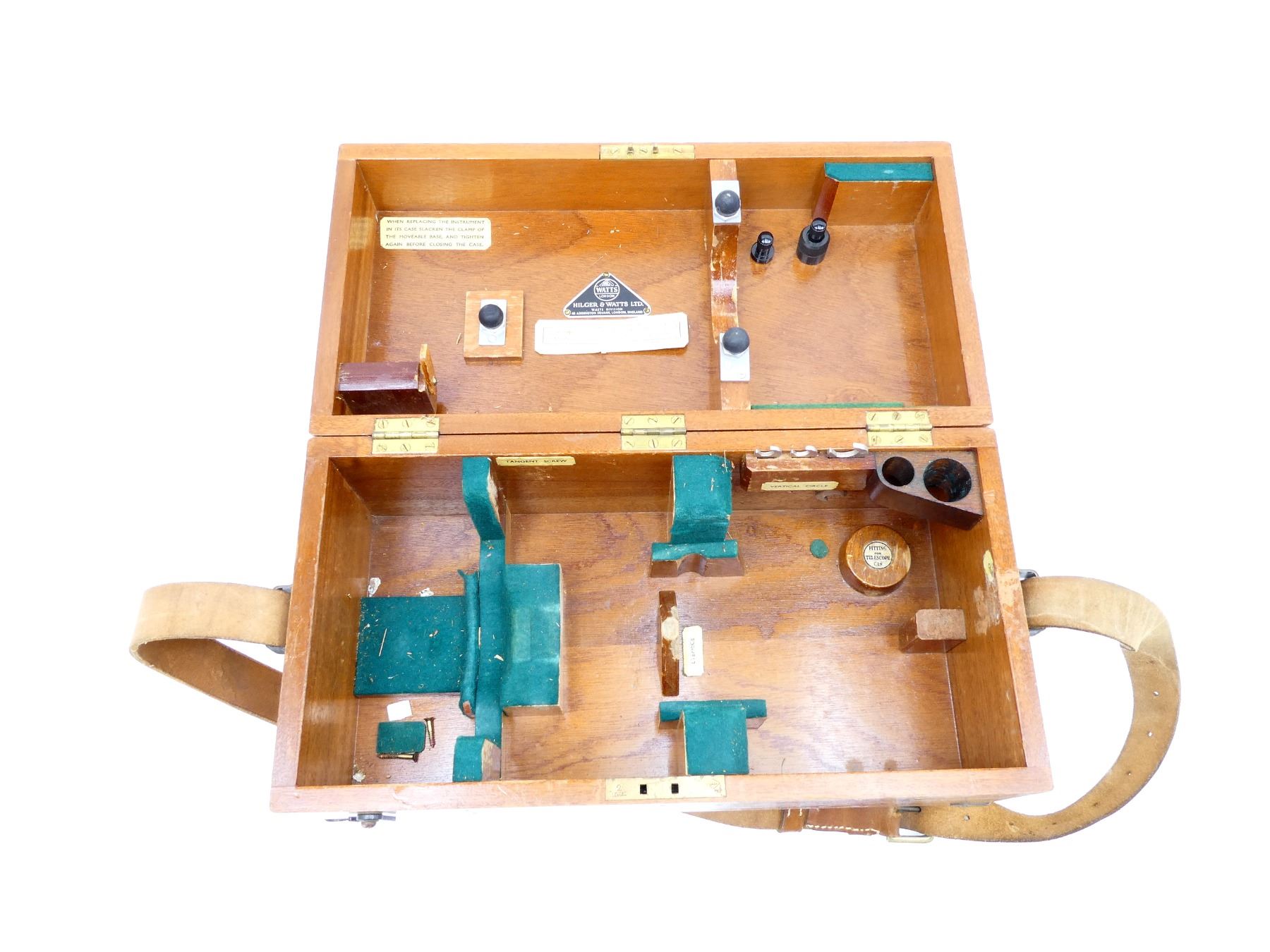 (1) SURVEYING INSTRUMENT WITH ROTATING TELESCOPE USED TO MEASURE HORIZONTAL / VERTICAL ANGLES, MICROMETER FOR MEASURING SMALL DISTANCES OR THICKNESSES BETWEEN TWO FACES, VERNIER A SMALL MOVABLE GRADUATED SCALE FOR OBTAINING FRACTIONAL PARTS OF SUBDIVISIONS ON A FIXED MAIN SCALE SUCH AS BAROMETERS, SEXTANTS, ETC., INSTRUMENT MARKED: "WATTS, LONDON, MADE IN ENGLAND", "HILGER & WATTS LTD, NO 108090", COMES WITH WOODEN CARRY CASE WITH LEATHER SHOULDER STRAP, VARIOUS WRENCHES, BRUSH, SCREWDRIVER, OILER, INSTRUCTION BOOKLET, ETC., GREEN PAINTED METAL CONSTRUCTION, ALL LENSES INTACT, FAIRLY CLEAR OPTICS, BUBBLE LEVELS INTACT, APPROX. 6" X 5.5" X 13.75", WOODEN CASE MARKED: "INV. TII, 6675/21/804/7755", INSTRUCTION BOOKLET DATED 1958, CASE SHOWS WEAR, MISSING A LATCH, WOODEN CASE APPROX. 16" X 8.25" X 7.5". SEE PHOTOS.