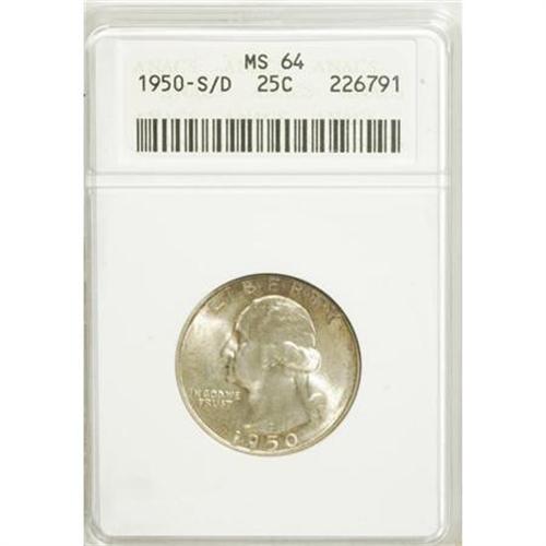 <B>1950-S/D 25C MS64 ANACS.</B></I> FS-601, formerly FS-022. OMM-1. A significant overmintmark variety that is pictured on page 169 of the 2008 <I>Guide Book</B></I>. This is a well struck example with strong mint luster and a pleasing light-gold cast, with mottled russet, green, and lilac patina near the peripheries. A few obverse tick marks limit the grade. <BR><BR><B>Coin Engraver:</B> John Flanagan<BR><BR><b>Shipping:</b> Coins & Currency (<a target="_blank" href="http://www.heritageauctions.com/common/shipping.php">view shipping information</a>)