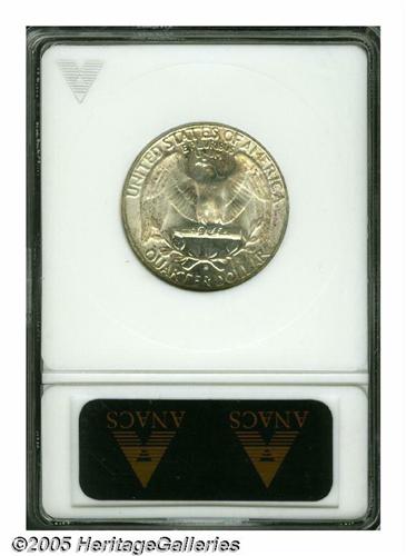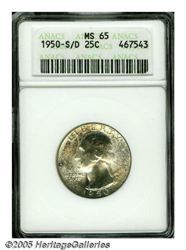<B>1950-S/D<25C> MS65 ANACS.</B></I> Lustrous surfaces are awash in speckled gold, blue, and lavender patina, and are seemingly free of mentionable marks. The design elements are well impressed.