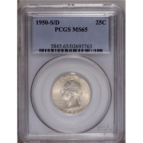 <B>1950-S/D 25C MS65 PCGS.</B></I> FS-022. Original olive-gray toning endows this lovingly preserved and satiny Gem. A high grade representative of the dramatic overmintmark <I>Guide Book</B></I> variety. Population: 47 in 65, 34 finer (1/06).