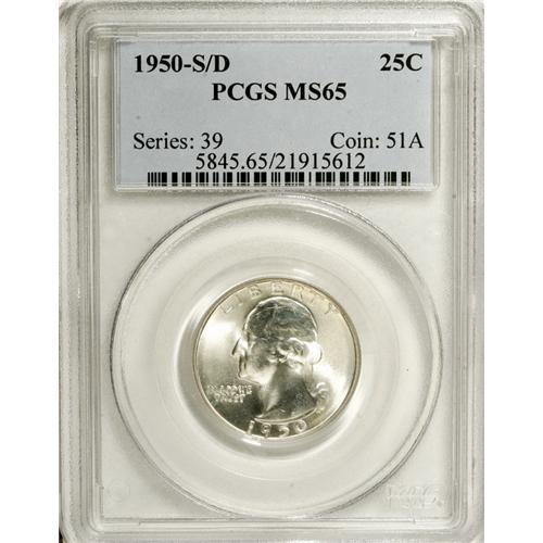 <B>1950-S/D 25C MS65 PCGS.</B></I> FS-022. Potent cartwheel luster dominates this brilliant and carefully preserved Gem. A significant overmintmark variety, listed on page 168 of the 2007 <I>Guide Book.</B></I> Population: 48 in 65, 34 finer (12/06).<BR><BR><b>Shipping:</b> Coins & Currency (<a target="_blank" href="http://www.heritageauctions.com/common/shipping.php">view shipping information</a>)