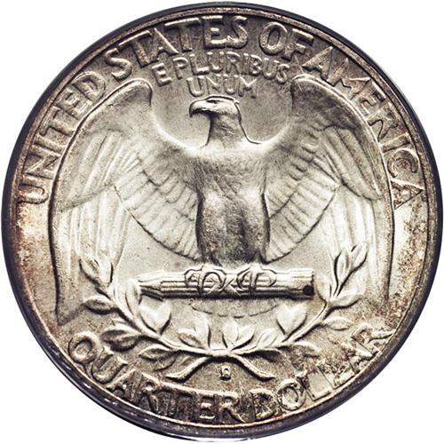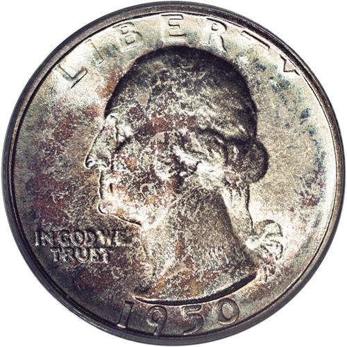 <B>1950-S/D<25C> MS66 PCGS.</B></I> FS-022. OMM-1. Both mintmarks are obvious on this example, a coin that takes no imagination to believe in. The obverse is toned in deeply mottled shadings of purple, blue, and golden, while the reverse is mostly brilliant with a trace of golden around the margin. Highly lustrous and very attractive.