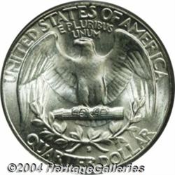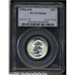 <B>1950-S/D<25C> MS66 PCGS.</B></I> FS-022. OMM-1. Technically an S/S/D, as the S mintmark is double punched--both mintmarks are prominent and easily seen with light magnification. The surfaces are frosted, as always, and brilliant throughout with no abrasions worthy of mention on either side. Population: 28 in 66, 4 finer (3/04). <BR><BR><B>Important notice:</B> Heritage usually auctions material at the rate of 200-250 lots per hour. On some occasions eBay Live bid software or the Internet may not be able to keep up with the pace of the auction. We recommend placing a realistic absentee bid now as insurance to avoid disappointment. Occasionally the auctioneer may eliminate or reject an eBay Live bid, and the auctioneer may also reopen a lot after the close of the eBay live bidding (usually because we missed an audience bid), and may reject your bid even if it shows you as the winning bidder. By bidding via eBay Live, you agree that Heritage may award the lot to another bidder at its sole discretion under the circumstances described above or any other reasonable circumstances. Since eBay bids are not shown to us until we open the lot on the floor, we treat those bids just like floor bids. In most cases the floor responds before the eBay bid is presented to us, due to Internet lag time, so for consistency we have made it a policy that floor bids are always considered first over tie eBay live bids. Also please note that all Heritage lots purchased through eBay Live carry a 20% Buyer's Premium. Please make sure you read the Terms and Conditions before you bid. </span></font></tr></table></td></tr></table>
