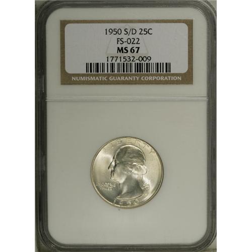 <B>1950-S/D 25C MS67 NGC.</B></I> FS-022. OMM-1. One of only two overmintmarks in the Washington quarter series. The other (a 1950-D/S variety) was made the same year, which suggests inexperience on the part of an unknown Philadelphia Mint worker in 1950. The highly lustrous surfaces are gently toned in honey and ice-blue hues. There are no abrasions worthy of mention on either side. Census: 5 in 67, 0 finer (11/06).<BR><BR><b>Shipping:</b> Coin/Currency (<a target="_blank" href="http://www.heritageauctions.com/common/shipping.php">view shipping information</a>)