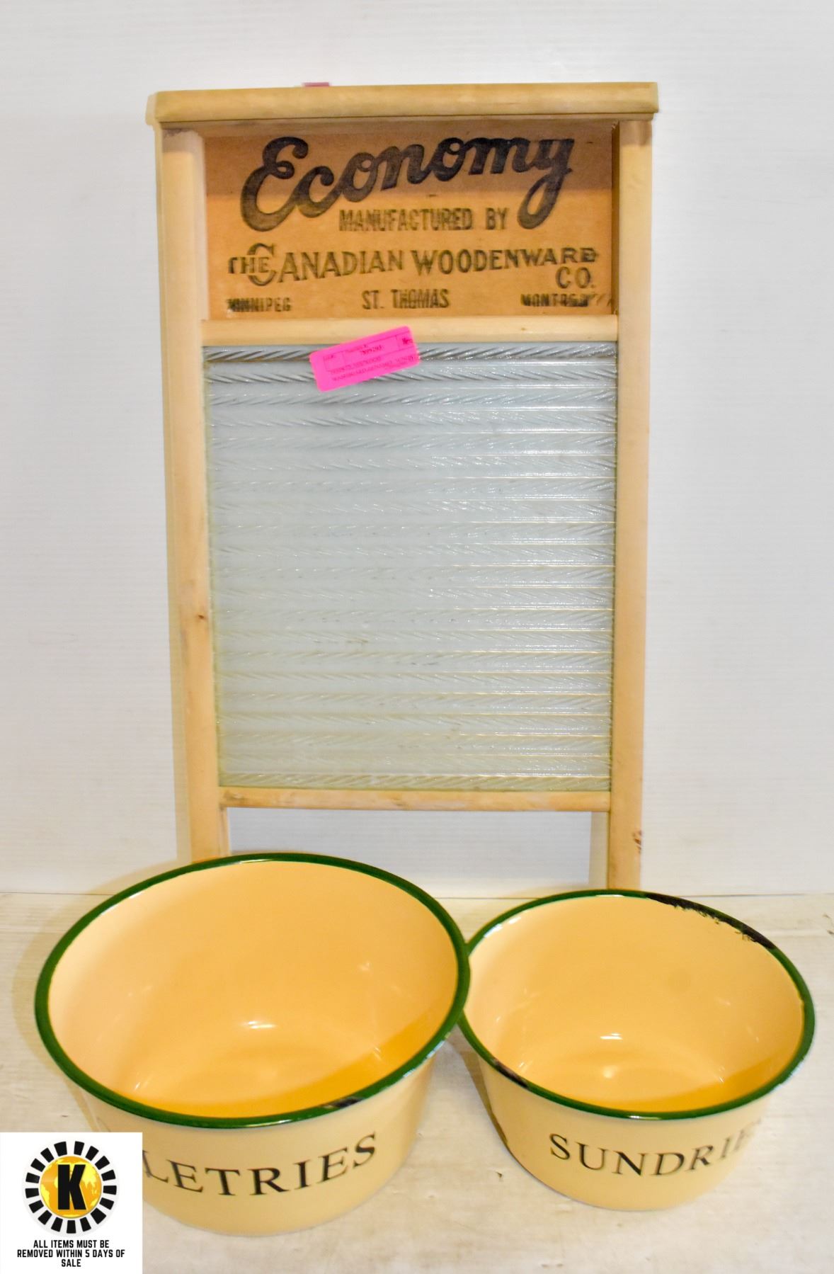 1950'S GLASS/WOOD WASHBOARD,&ENAMEL SUNDRY BOWLS