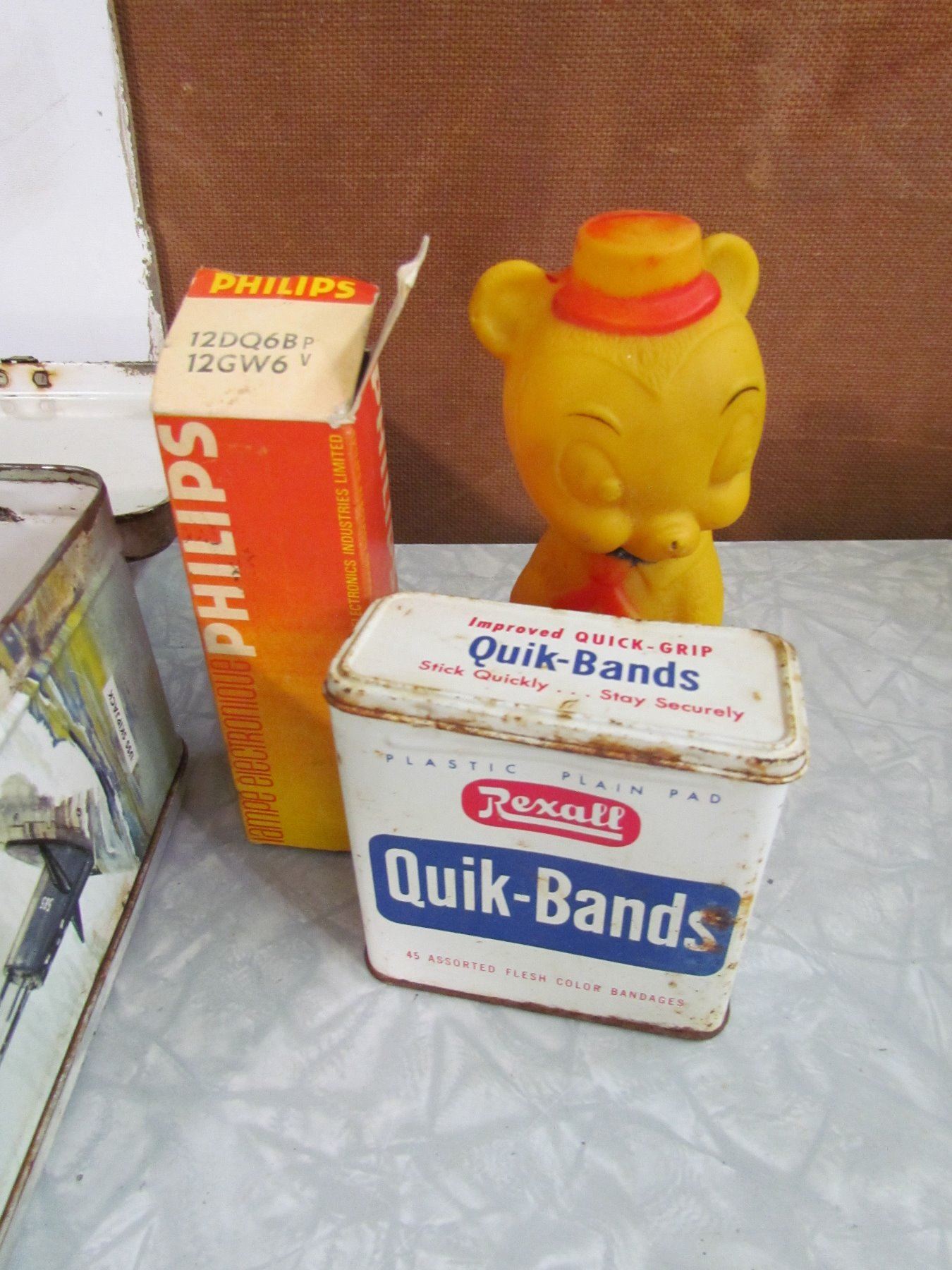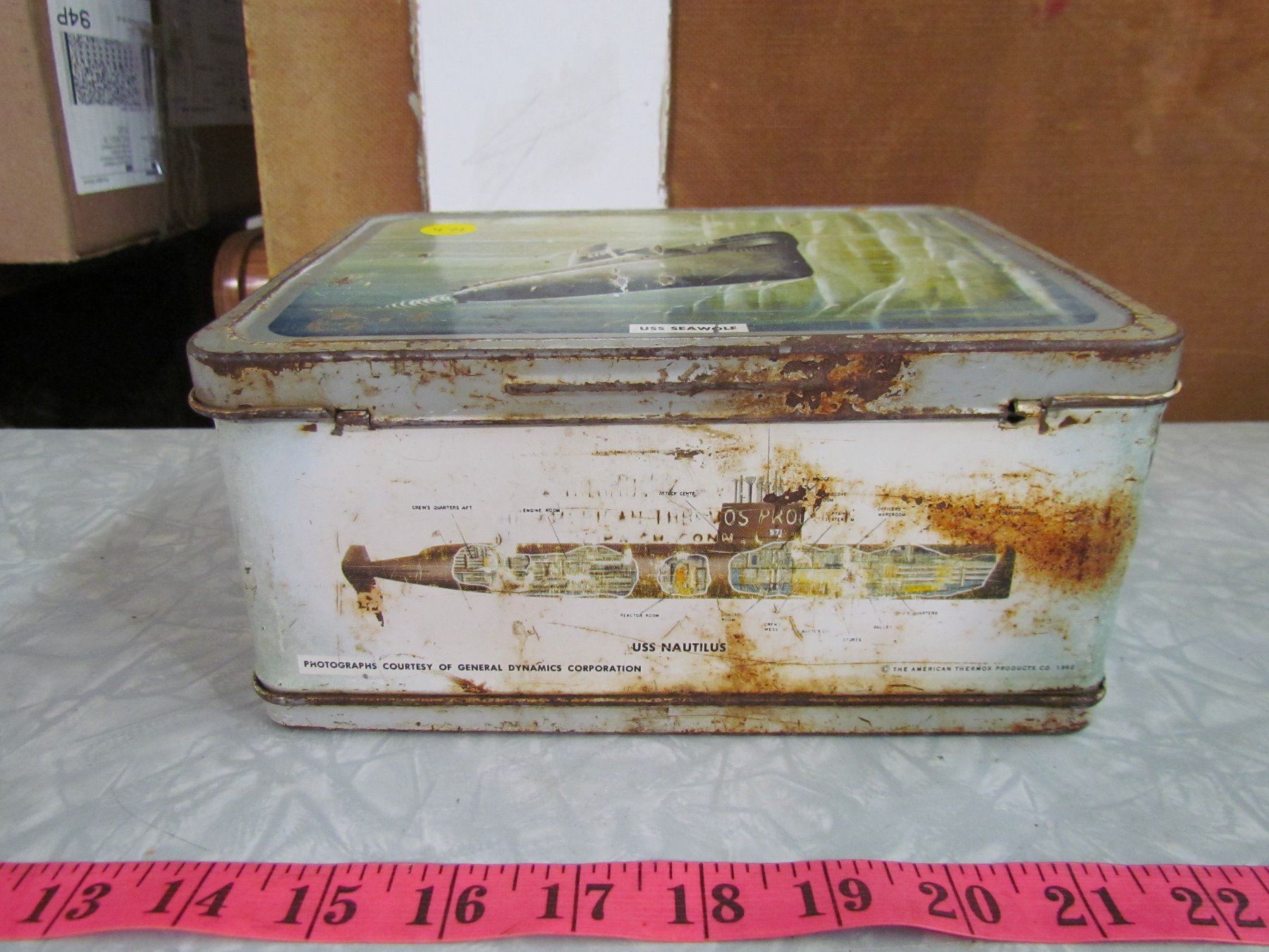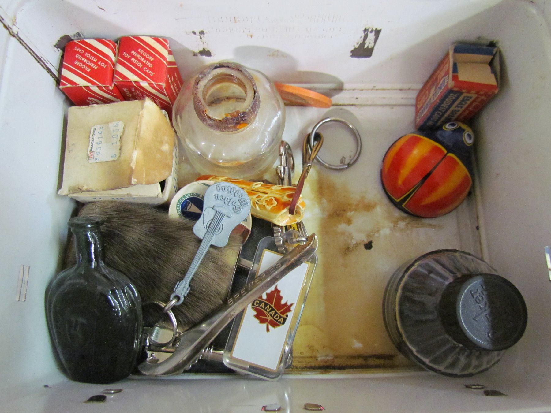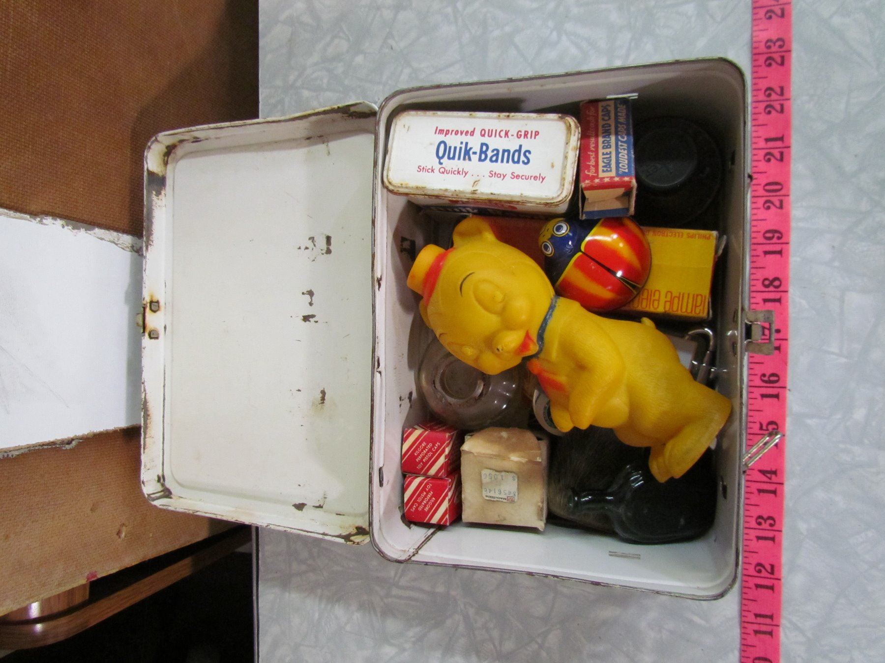 1950'S LUNCH KIT (NO HANDLE OR THERMOS) *MISC. ITEMS INSIDE INCLUDED*