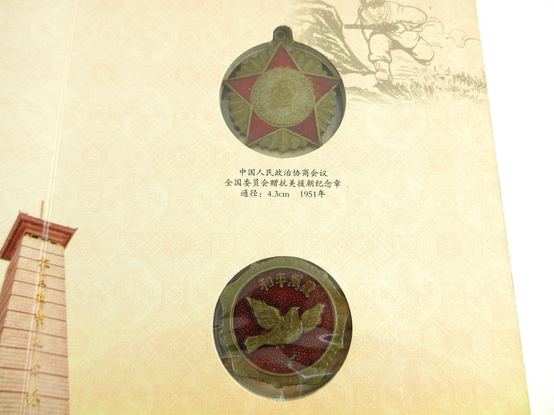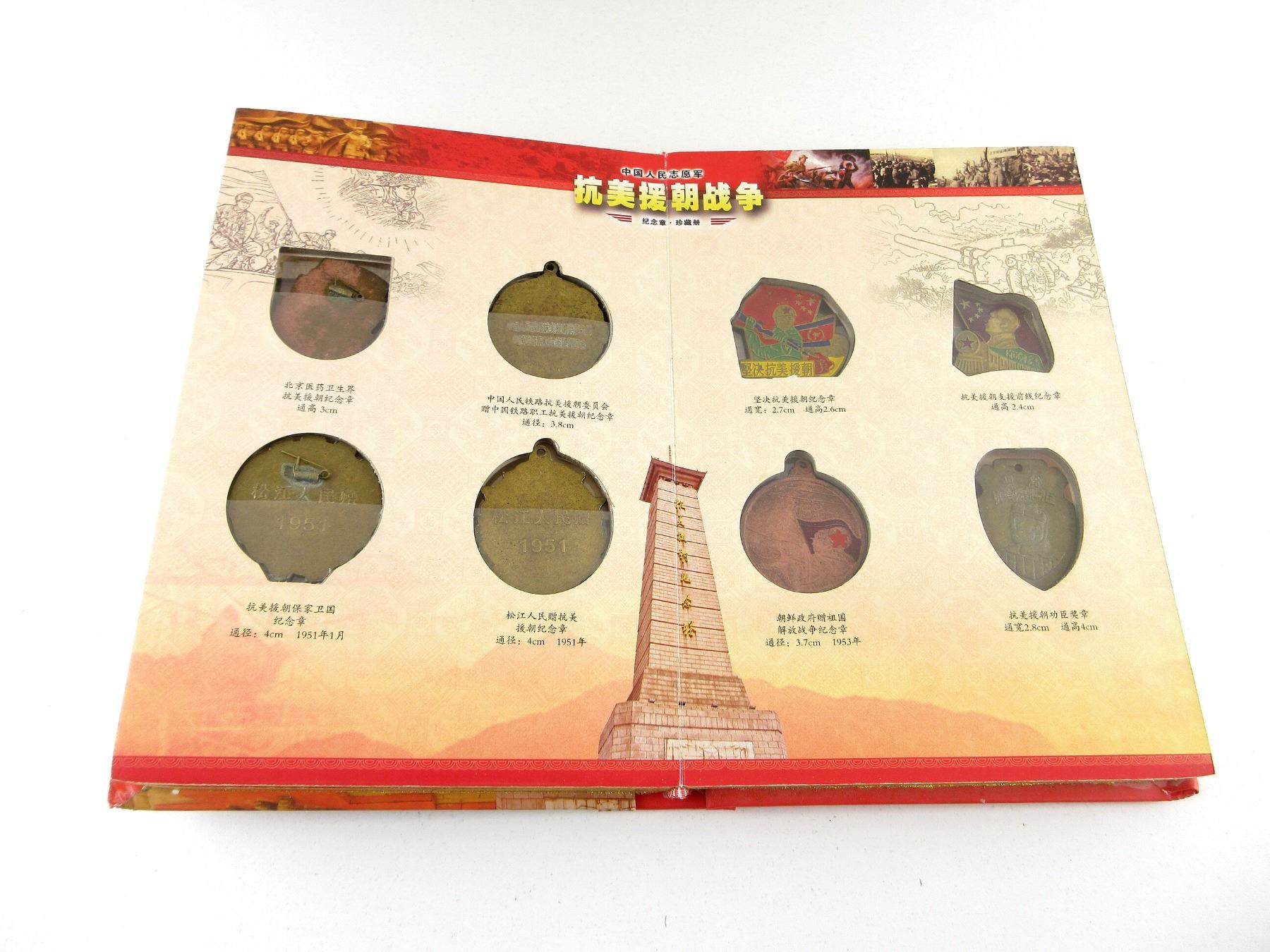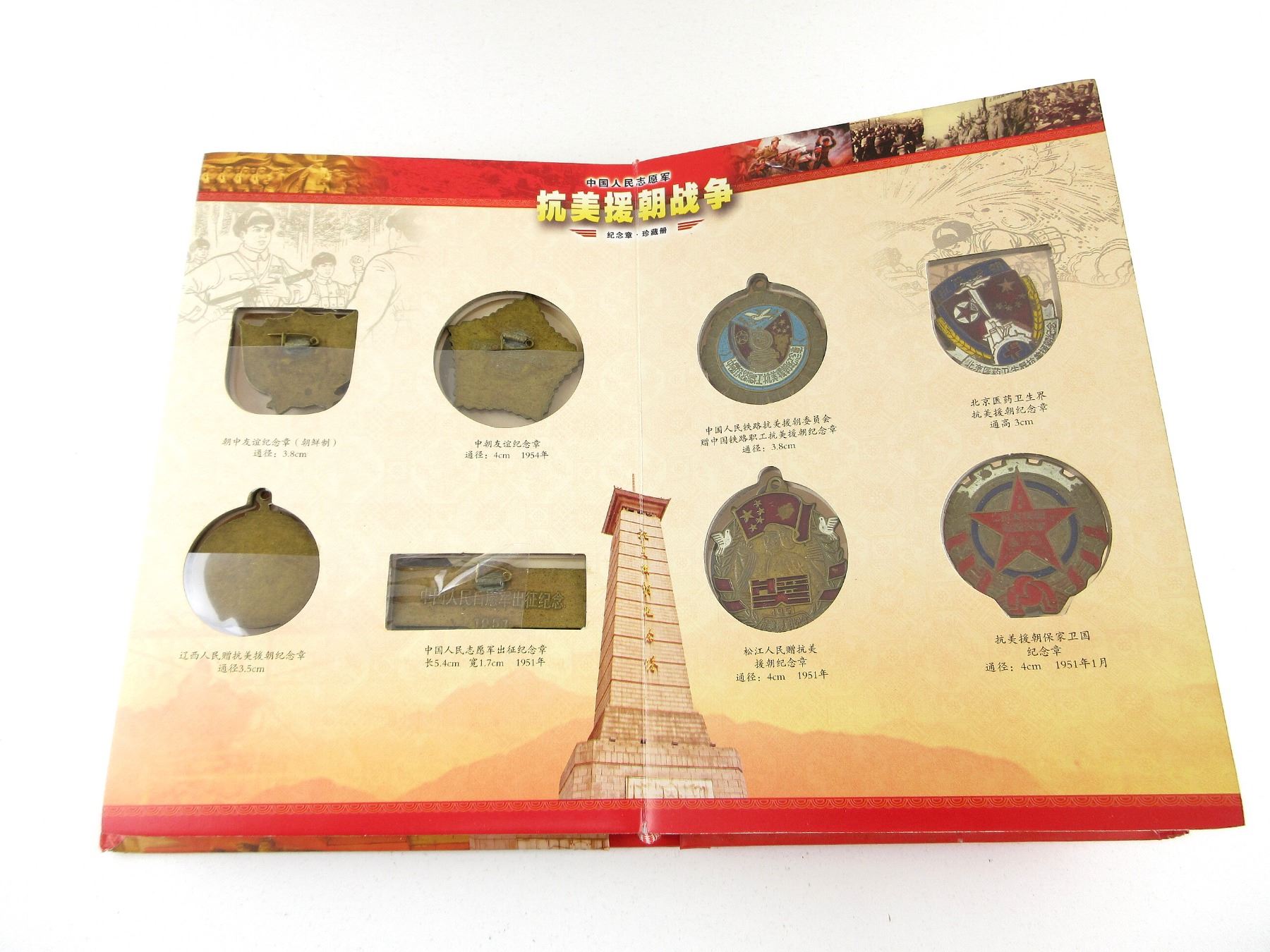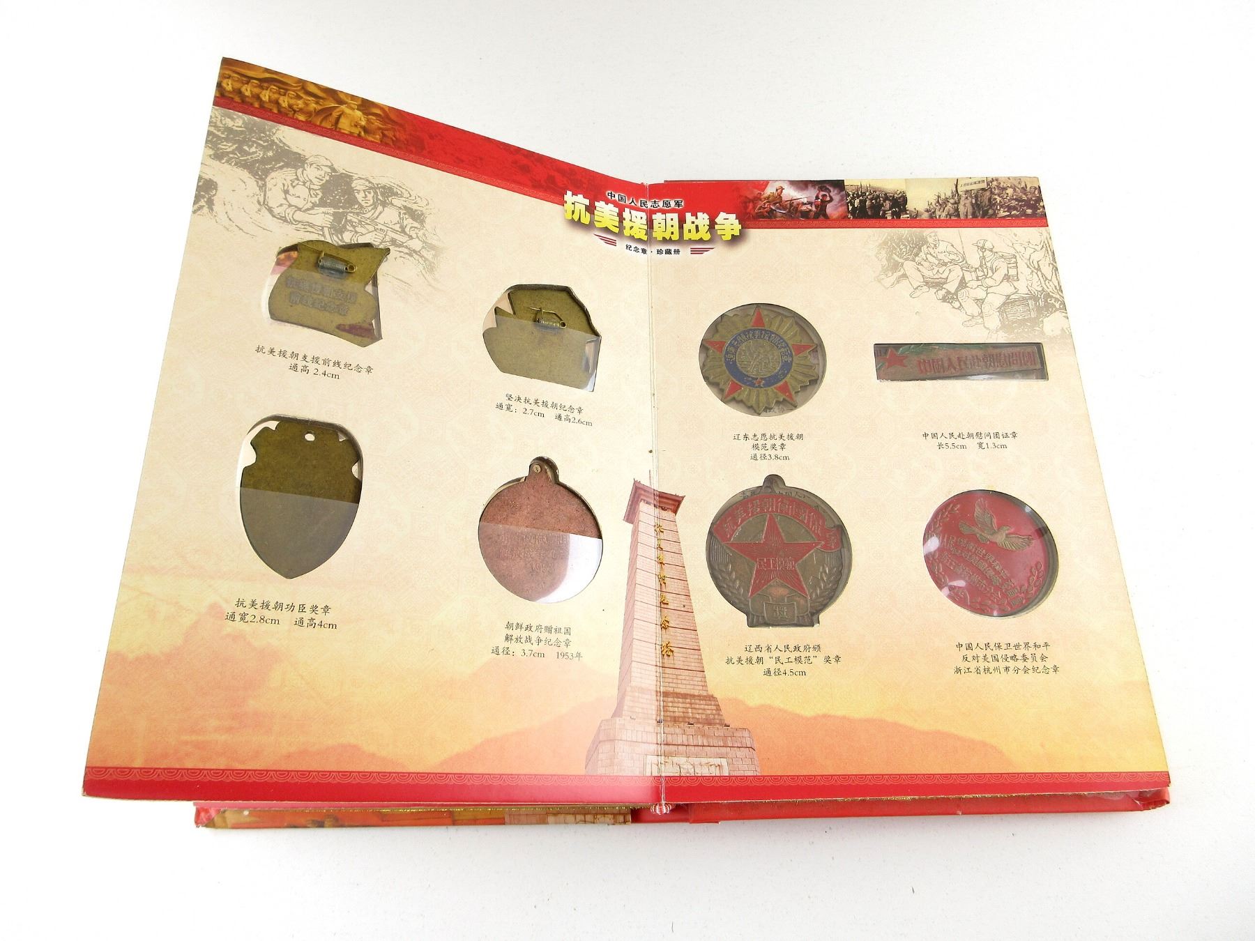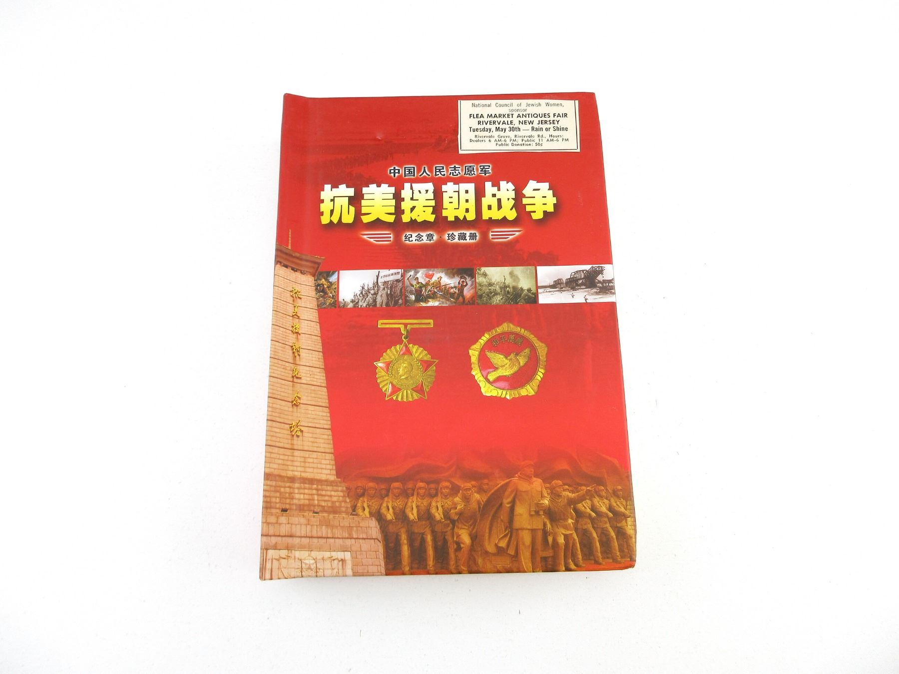 APPROX. (18) WAR MEDALS, SOME DATED 1951 TO 1954, SOME UN-DATED, VARIOUS MARKINGS, ALBUM IS HARD COVER, IN CHINESE, ALBUM IS APPROX. 8 5/8" X 6" X 1.5". SEE PHOTOS.