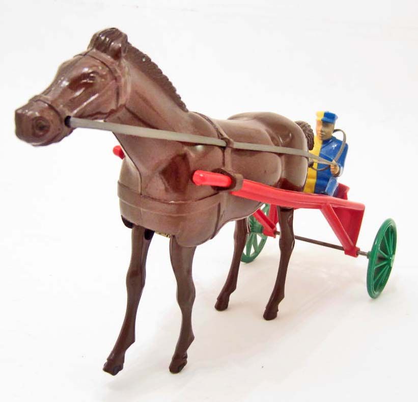 1950'S WOLVERINE WIND UP JOCKEY ON CART WITH RACE HORSE