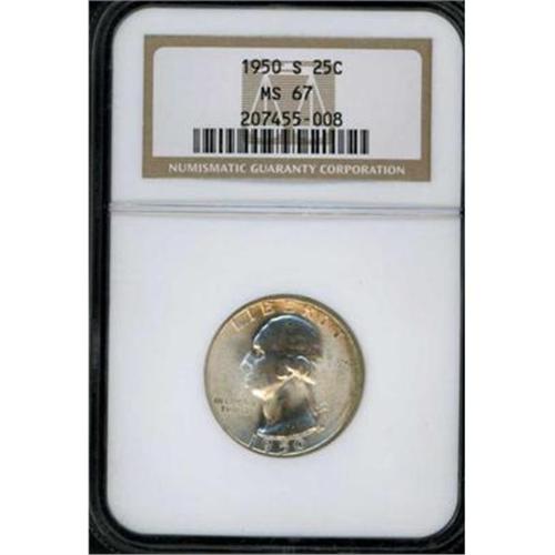 <b>1950-S Washington Quarter Dollar. NGC graded MS67.</b> From center to periphery the intense flood of silvery luster glows with this better 1950-S example. Most of these are filled with bagmarks, which is why collectors are drawn to the few certified MS67 specimens for their Registry Sets <b>(PCGS # 5844)</b>