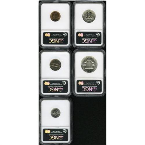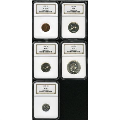 <B>1950<img border='0' src='http://www.heritagecoins.com/images/star.gif' width=10 height=10>ET> Proof Set PR65 to PR66 NGC.</B></I> The set includes: <B>cent PR65 Red,</B></I> copper-red with patches of orange and minimal carbon; <B>nickel PR65,</B></I> light peach patina, reverse rotated around 10 degrees clockwise; <B>dime PR65,</B></I> deeply reflective and practically untoned; <B>quarter PR66,</B></I> streaks of hazy toning on the obverse; and <B>half PR65,</B></I> fully brilliant with some milk spots on the reverse.