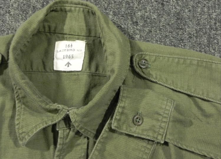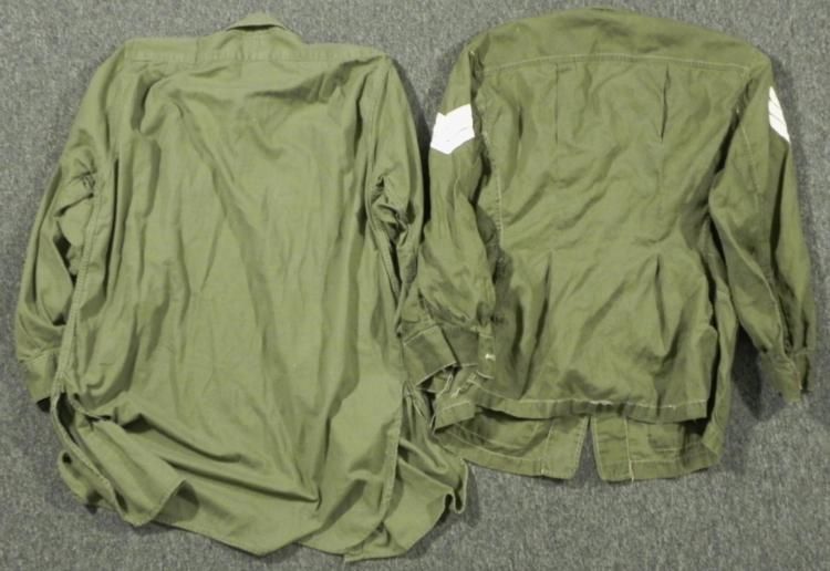 1950 STYLE BRITISH BUSH JACKET & NORTHERN IRELAND/BRIT 1965 MILITARY SHIRT-BOTH W/BROAD ARROWS * 2 HARD TO COME BY UNIFORM ITEMS--BRITISH MILITARY WARM WEATHER SHIRT MARKED 16 1/2-LADYBIRD NI (NORTHERN IRELAND--1965 W/BRIT BROAD ARROW AND--BUSH JACKET/BRITISH MARKED 1050 PATTERN-SIZE 6-HEIGHT 5'7 TO 5'8"-BREAST 38-40 "-WAIST 33-35"--MAKER CEMAN 1951--TAG ALSO STAMPED WITH BRIT BROAD ARROW-GOOD CONDITION W/EPAULETS & CHEVRONS *