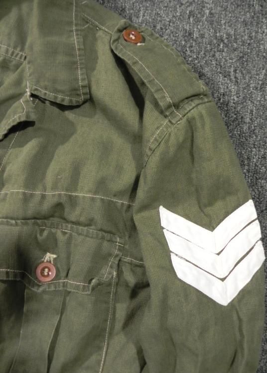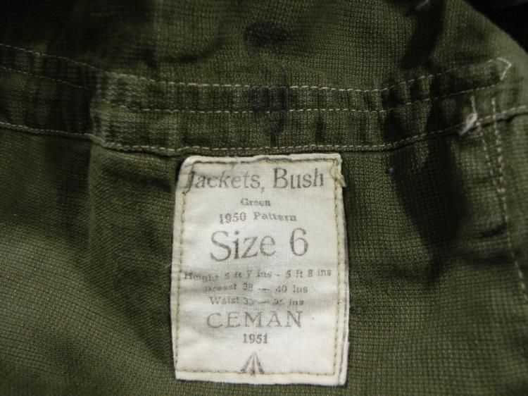 1950 STYLE BRITISH BUSH JACKET & NORTHERN IRELAND/BRIT 1965 MILITARY SHIRT-BOTH W/BROAD ARROWS * 2 HARD TO COME BY UNIFORM ITEMS--BRITISH MILITARY WARM WEATHER SHIRT MARKED 16 1/2-LADYBIRD NI (NORTHERN IRELAND--1965 W/BRIT BROAD ARROW AND--BUSH JACKET/BRITISH MARKED 1050 PATTERN-SIZE 6-HEIGHT 5'7 TO 5'8"-BREAST 38-40 "-WAIST 33-35"--MAKER CEMAN 1951--TAG ALSO STAMPED WITH BRIT BROAD ARROW-GOOD CONDITION W/EPAULETS & CHEVRONS *