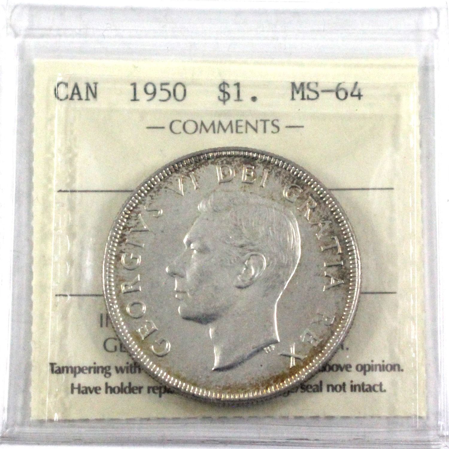 1950 Silver $1.00 ICCS Certified MS-64 SWL. Lightly toned throughout. With mirror like finishes.