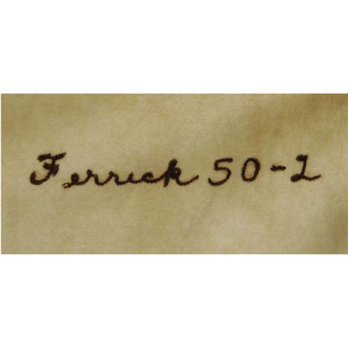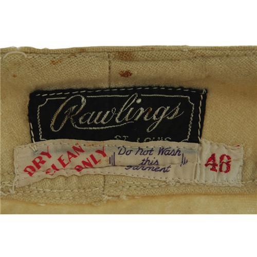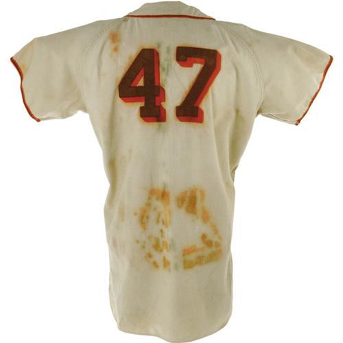 <B>1950 Tom Ferrick Game Worn Jersey.</B></I> Tremendously rare flannel derives from the personal collection of top baseball executive Harry Dalton, who joined the American League club the first season of its relocation to Baltimore. This home white flannel was issued to pitcher Tom Ferrick, whose surname is stitched into the tail with "50-1" set identifier. "Browns" is sewn to the chest in distinctive brown and orange felt, with number "47" applied to verso. While Ferrick is listed as having worn number "24" for the 1950 Browns, clearly this jersey was at the very least intended for his use, and no number change is evident. A considerable amount of staining should be evident in our catalog imagery, the result of a flood that released dyes from the felt identifiers into the white flannel. Nonetheless, the jersey still presents well, and its misgivings must be somewhat excused in light of its scarcity. Functional zipper front, and "Rawlings size 48" tagging in collar, with "Dry Clean Only" instructions. <I>LOA from Lou Lampson.</B></I><BR><BR><b>Shipping:</b> Clothing, Costumes & Jerseys (<a target="_blank" href="http://www.heritageauctions.com/common/shipping.php">view shipping information</a>)