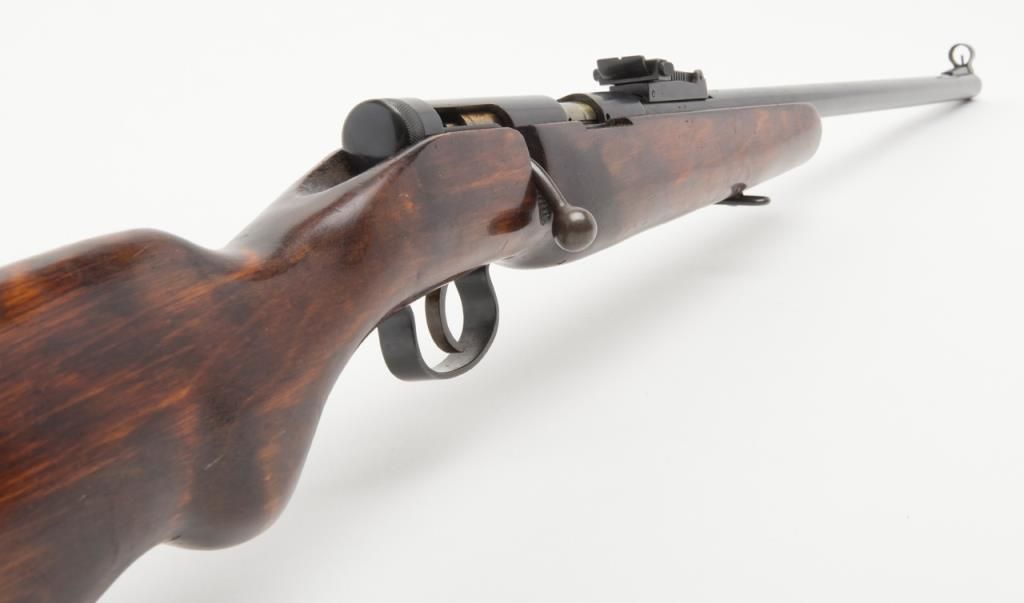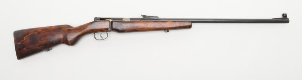 1950 Tula manufactured bolt action single shot rifle, .22 caliber, Serial #6645. The rifle is in overall very good condition with a 24” barrel. The barrel and action retain nearly all of their blued finish with only light surface frecklingvisible. The smooth wood stock is in very good condition with small mars and scratches consistent with use. The rifle has sling swivels and a smooth metal butt plate as well. The bore is very good, action crisp and markings sharp on thisrifle. (Modern/PPT). Est.: $75-$125.