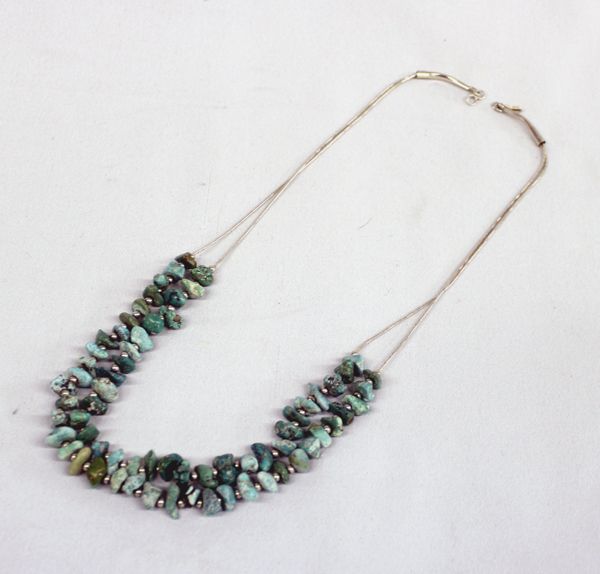 1950s Sterling Silver & Turquoise Nugget Necklace. Natural turquoise nuggets with sterling bead spacers between each, two strands finished with liquid silver beads, shaped sterling cones. The necklace measures 23'' with a 1'' drop on the second strand. Exquisite natural turquoise.