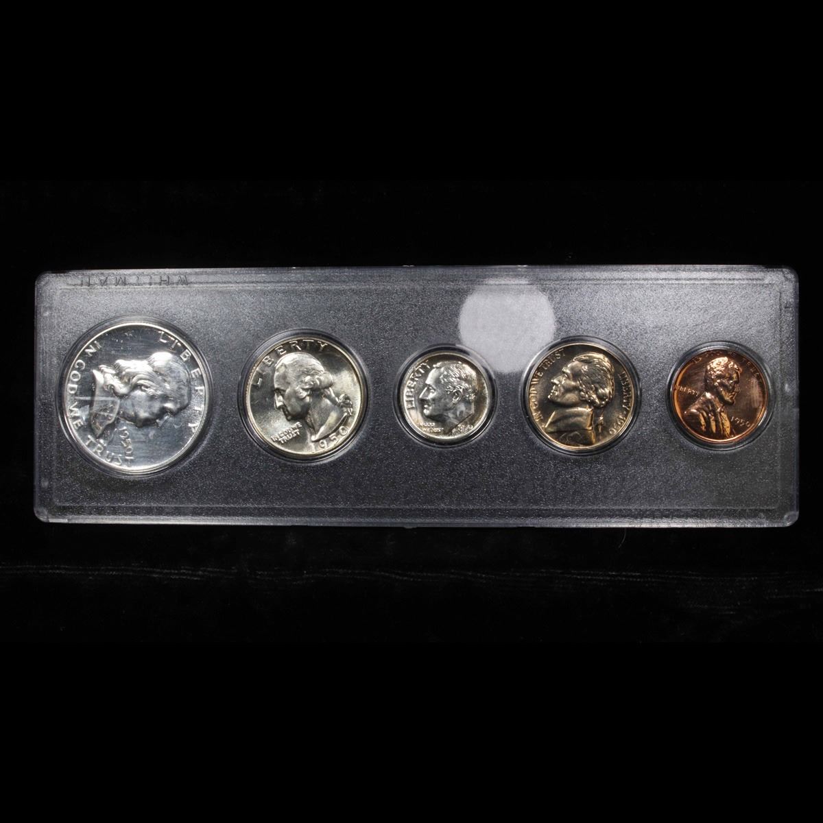 1950 United States Proof Set in Whitman Plastic Holder.        This set, has a 90% Proof Silver Franklin Half Dollar, a 90% Proof Silver Quarter, a 90% Proof Silver Dime, plus the proof nickel and proof penny.   All encased in a Whitman Plastic Holder.
