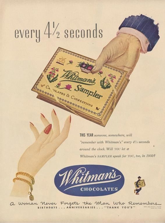 Original 1950 magazine advertisement for Whitman's Chocolates, their famous "Sampler" box of chocolates confections. Slogan reads, "every 4 1/2 seconds... A Woman Never Forgets the Man Who Remembers Birthdays...Anniversaries..."Thank You's". 10" X 13 1/2". Mounted on archival linen canvas for preservation.