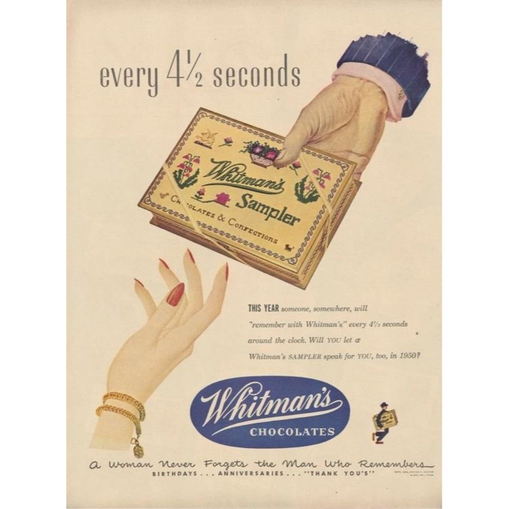 Original 1950 magazine advertisement for Whitman's Chocolates, their famous "Sampler" box of chocolates & confections. Slogan reads, "every 4 1/2 seconds... A Woman Never Forgets the Man Who Remembers Birthdays...Anniversaries..."Thank You's". 10" X 13 1/2". Mounted on archival linen canvas for preservation.
