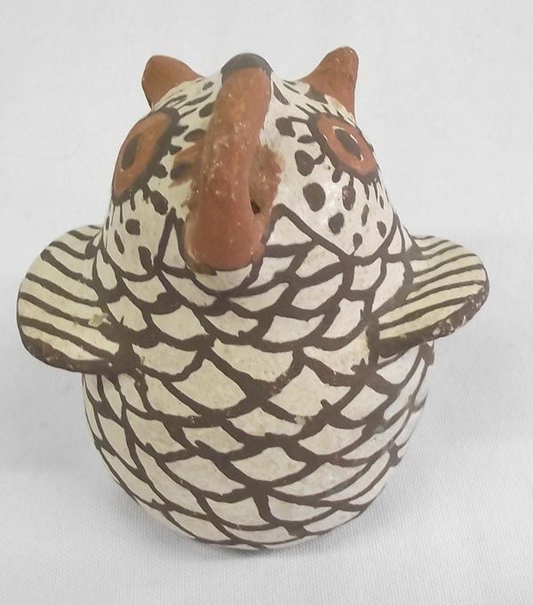 1950 Zuni Pueblo Painted Polychrome Pottery Owl, with Hook Bill. Traditionally Hand Made Polychrome Owl in multi colors of Rust, Brown and Cream colors. Good condition for Age. Measures 3.5'' x 3'' x 3''.