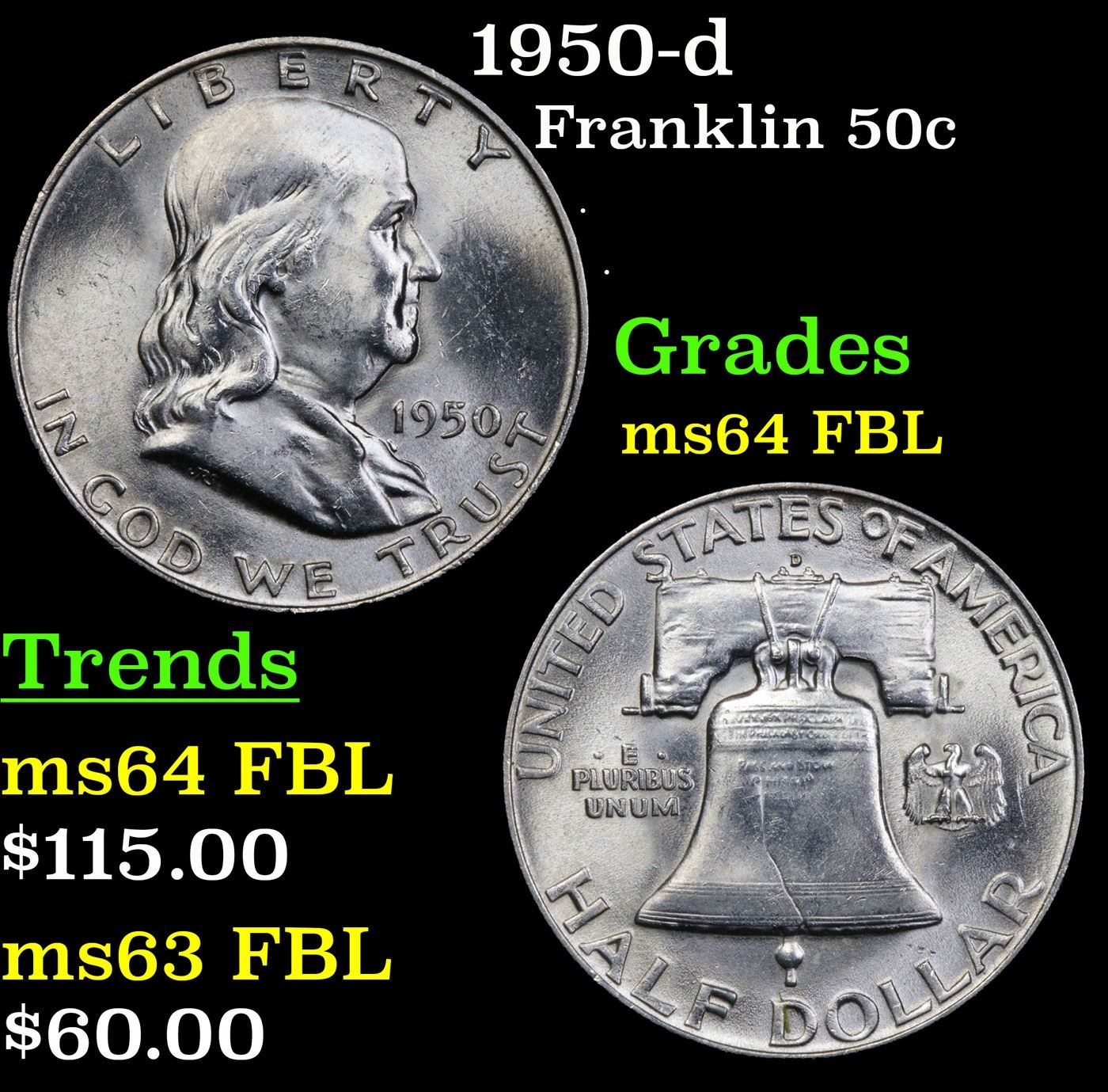 1950-d Franklin Half Dollar 50c Grades Choice Unc FBL.