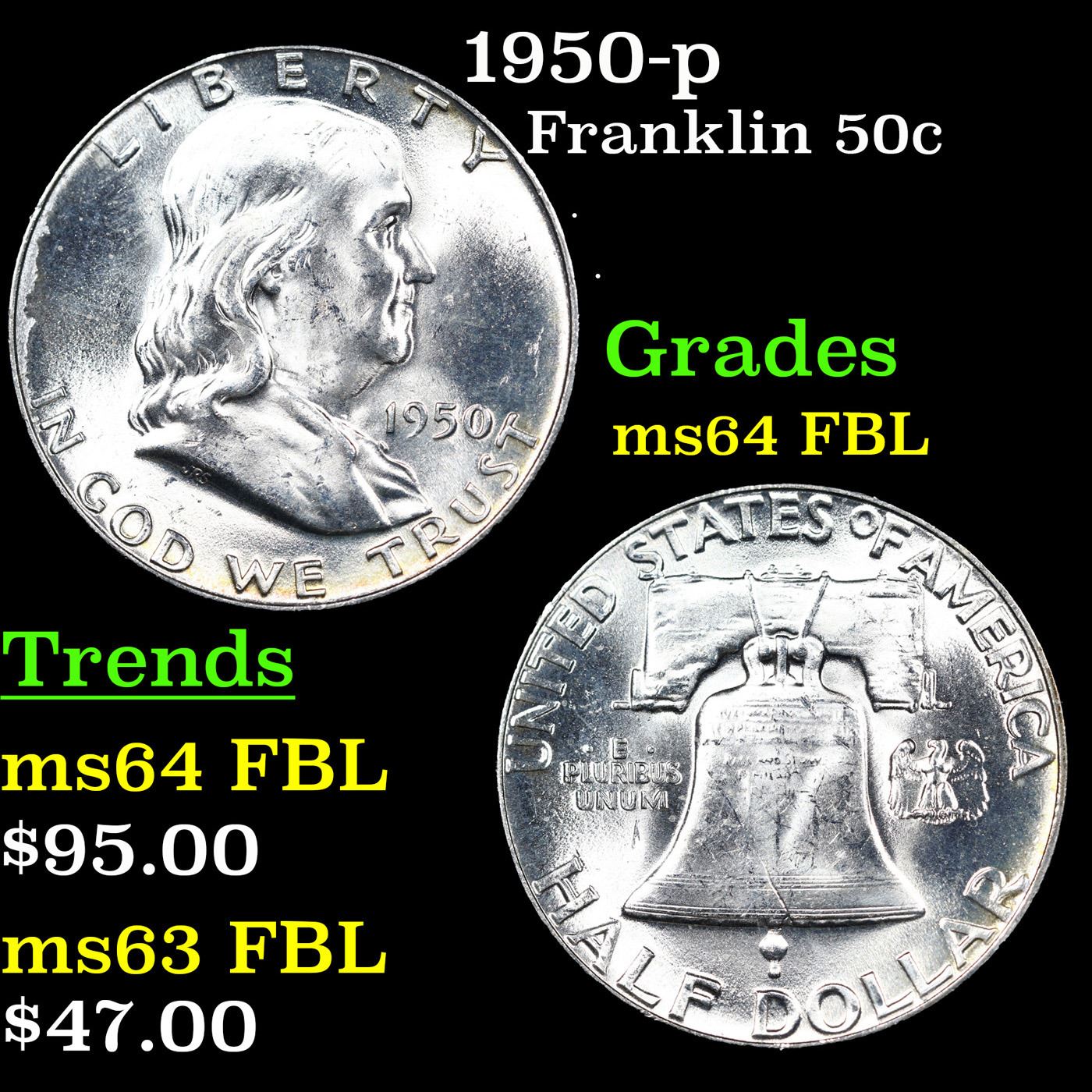 1950-p Franklin Half Dollar 50c Grades Choice Unc FBL.