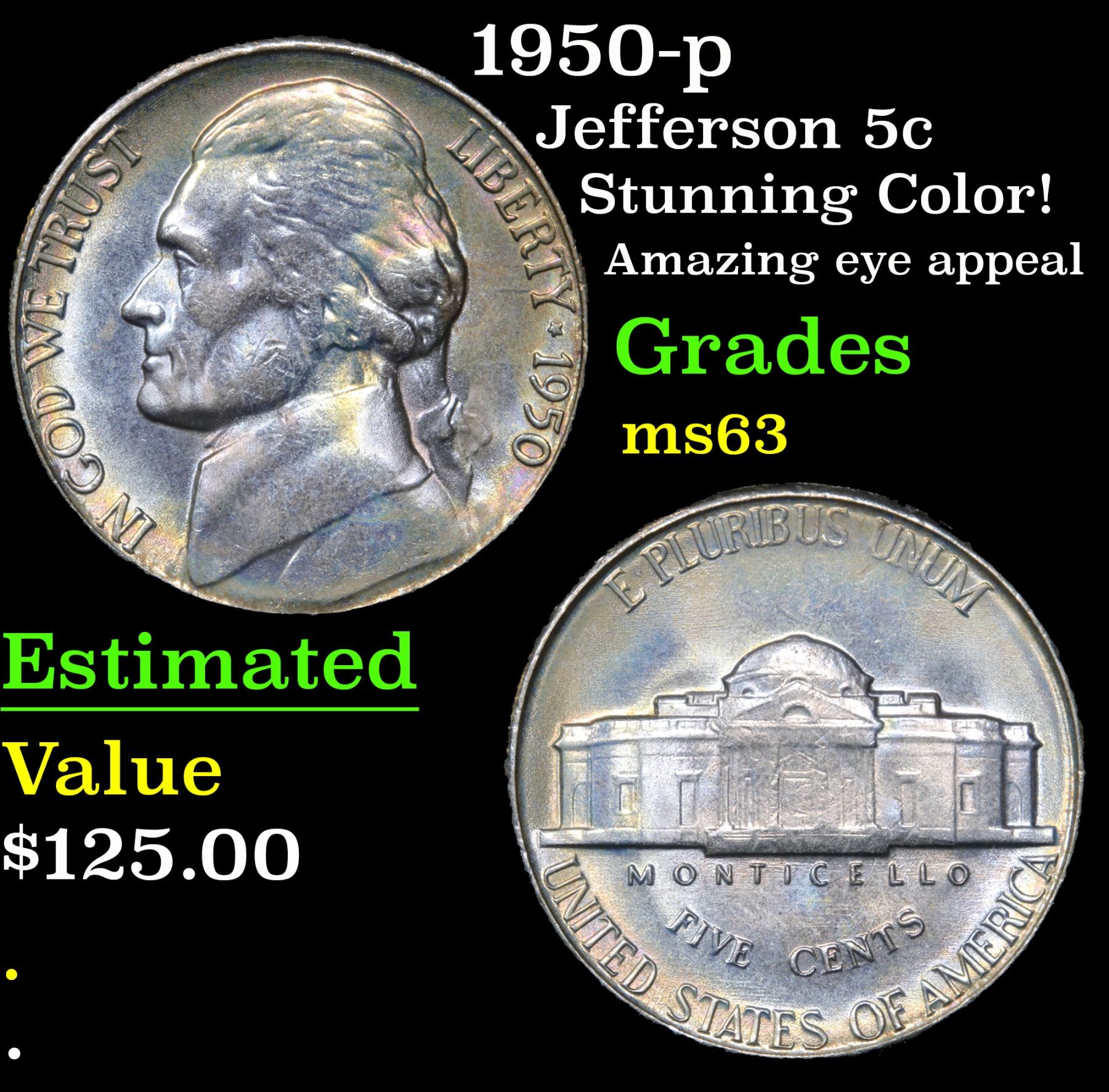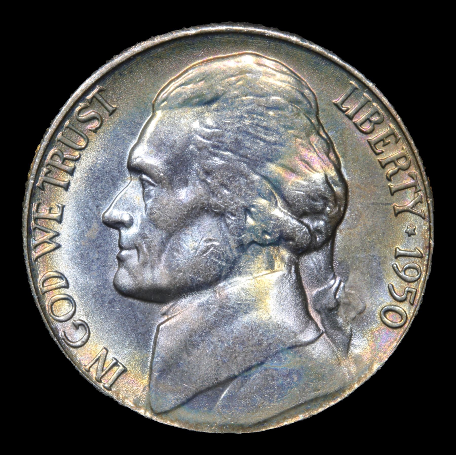 1950-p Jefferson Nickel 5c Grades Select Unc. Stunning Color!; Amazing eye appeal A Corey's Pick, Bid to Win Coin