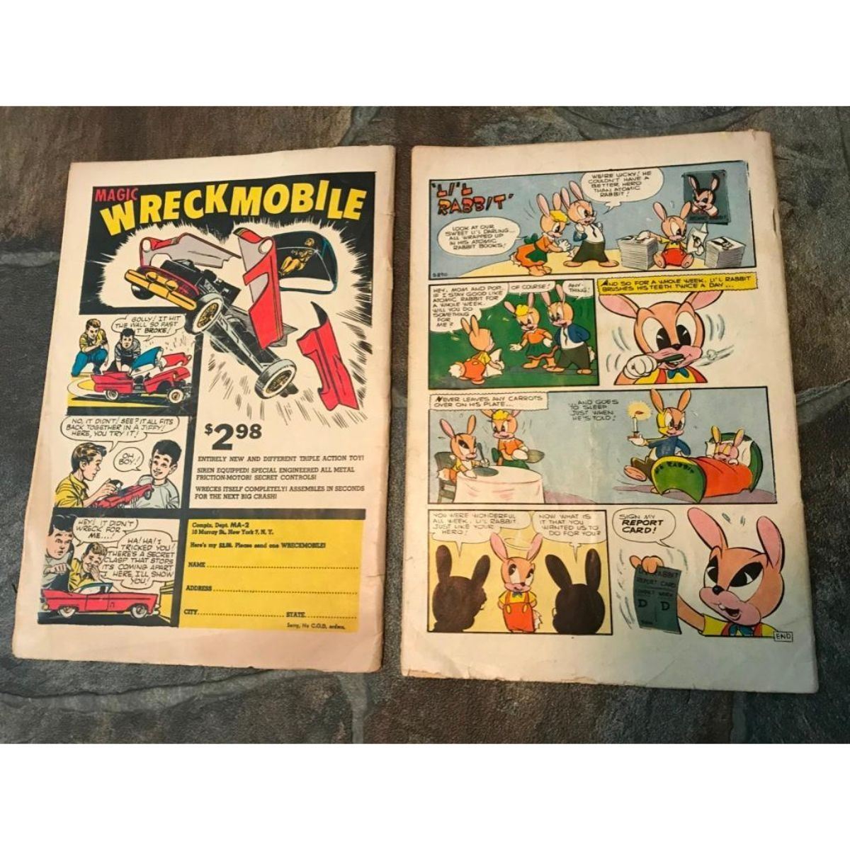 1950's Atomic Age comic books, Mighty Atom & Atomic Rabbit. Golden Age 1955 Atomic Rabbit by Charlton Publication. No 4. & Silver Age 1957 Mighty Atom ( Japanese Astro Boy precursor ), mostly detached from cover, with minor losses, including small water stain to cover.