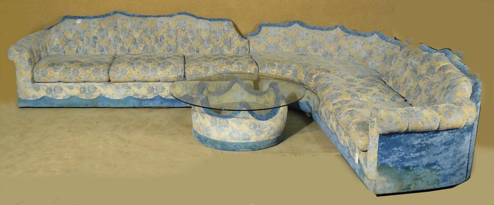 1950's Atomic 3 piece sectional sofa with round blue coffee table